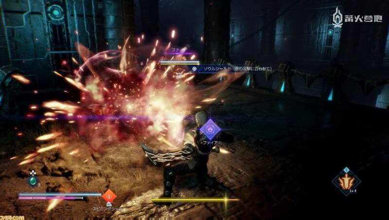 敌人使用某种技能的时候,头顶上会显示技能名。当玩家使用灵魂圣盾接下技能名闪烁着紫光的攻击之后,就能将其作为瞬时技能储存起来,按下 □ 按钮就能使用该技能。