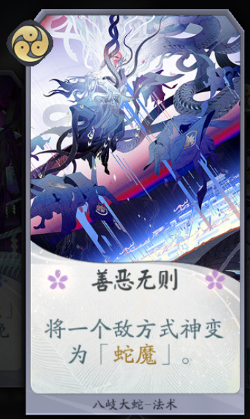 善恶无则:将一个敌方式神变为蛇魔,3勾变形类法术,不同与其他的变形法术没有变化的回合限制也没有变化类型的要求,3勾把对面强力式神变为蛇魔让对面自己送掉会非常影响敌方节奏。推荐程度:慢速玩法可以考虑携带1/2