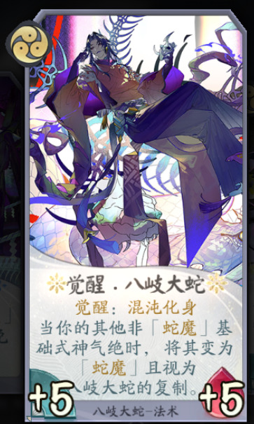 觉醒.八岐大蛇:提升5/5的身材,使用后会像九命猫一样移除所有八岐大蛇的牌,而且混沌化身的效果让我们无法使用八岐大蛇,完全由化身自动打牌。场上其他气绝的式神,会变化为八岐大蛇复制一样的蛇魔,(获得同样的身材一样无法控制)大家注意的是之前的蛇魔不会变成觉醒后的复制,只能觉醒后气绝的式神才行。混沌化身一样会打出战斗牌和非觉醒的法术牌,所以觉醒八岐大蛇会指挥复制八岐大蛇身材的蛇魔发动进攻或者使用善恶无则变化对面式神。而面对巨大的身材对面想去除躲在后面指挥的觉醒八岐大蛇需要付出大量的资源,才能停止蛇魔的进攻。推荐程度:慢速玩法强烈推荐两张