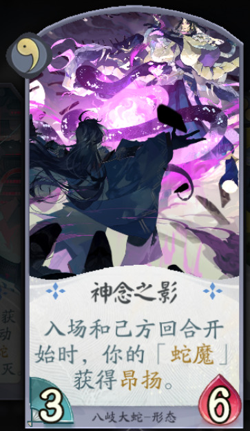 神念之影:1勾形态,入场或己方回合时让蛇魔获得昂扬(昂扬的效果是式神下一次出击不消耗出击次数)而蛇魔有迅捷完美和昂扬搭配。所以神念之影让我们蛇魔配合进攻节奏更加流畅。推荐程度:强烈推荐带2