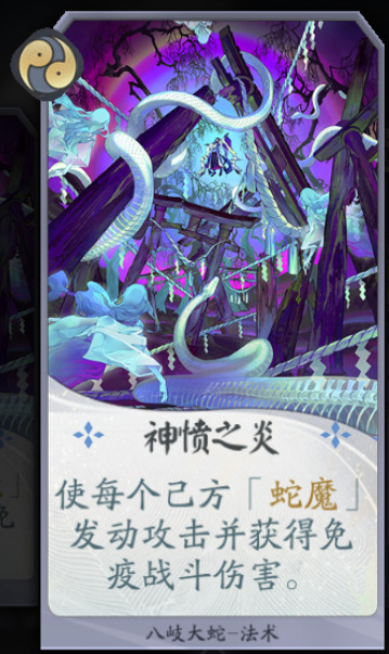 神愤之炎:使每个己方蛇魔发动攻击并获得免疫战斗伤害,蛇版净琉璃。当我们场上都是蛇魔打出来的效果非常强大,配合蛇魔的迅捷能力攻击频率极高,甚至像净琉璃一样可以直接终结对局。推荐程度:快攻玩法强烈推荐带2,中慢速玩法可以考虑携带1/2