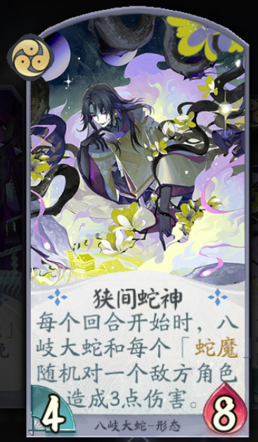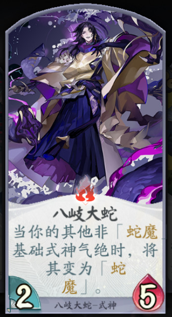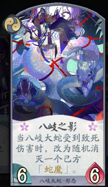八岐大蛇2/5身材,基础能力是其他式神气绝时,将其变化为蛇魔(蛇魔的身材3/3带有迅捷),让死去的队友变化为蛇魔继续作战,非常有意思的玩法,我们说一下基础能力优缺点吧,先是优点其他式神气绝后不会停止进攻变化蛇魔继续作战,让对手无法解掉我们式神阻止我们的进攻,蛇魔的迅捷配合八岐大蛇或者其他式神进攻节奏让不管对面如何防守都会触发源源不断的攻势。缺点是我们大部分式神都变化为蛇魔时,八岐大蛇被击杀,会让我们没办法发挥蛇魔的进攻性,变成一回合只能出击一次蛇魔的尴尬局面,而且变化蛇魔意味着我们蛇魔不死我们也无法使用式神的牌,长期无法从蛇魔变回来的式神非常影响我们的战斗力。从基础能力我们就能看出八岐大蛇是非常有侵略性的式神,如果对手不在关键时候击杀八岐大蛇,蛇魔与他的配合会让对手立刻受到大量伤害甚至直接输掉整场对局。