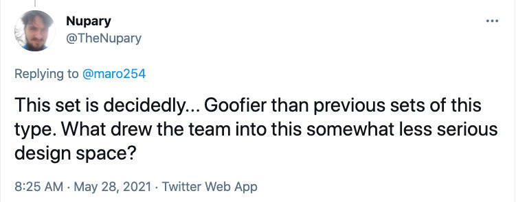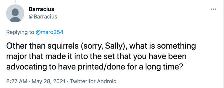我想多年前松鼠离开黑框的原因是,它们当时不符合这游戏的调性:对于黑框来说,它们太蠢了。 我想在那之后很多事情都改变了。 第一,我认为现在万智牌的调性比较开放了。 我们现在也会鼓励设计制作出感觉轻快的卡牌。 我们制作元件,然后你们游玩游戏,所以就让喜欢更呆那一边的玩家能获得更多呆的东西吧。