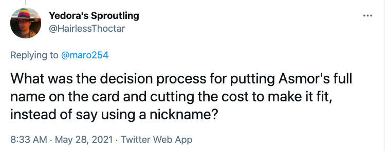 问:是什么让你们决定将阿司魔的全名放在卡牌上然后砍掉费用,而不是使用像是昵称呢?
