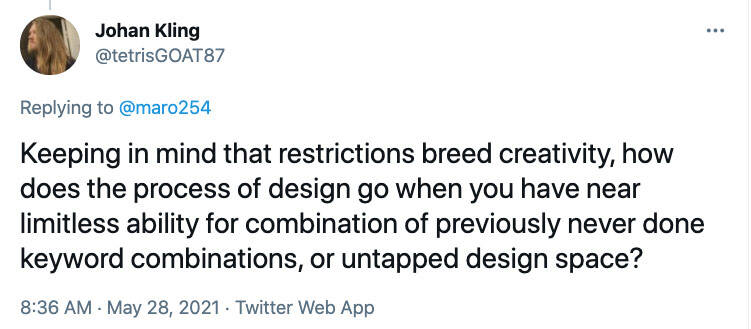 问: 限制能孕育创意。 在这种情况下,当你们有没做过、近乎无限的关键字组合,或是没使用过的设计空间时又会如何处理设计呢?