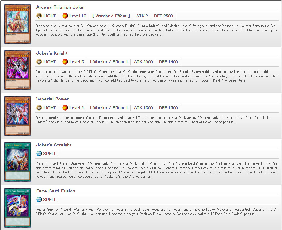 丢弃1张手卡,从卡组把1只「王后骑士」特殊召唤,从卡组把1只「国王骑士」或者「卫兵骑士」加入手卡。那之后,可以把1只怪兽召唤。这个回合,自己不是战士族·光属性怪兽不能从额外卡组特殊召唤。结束阶段,这张卡在自己墓地存在的场合:可以以自己墓地的1只战士族·光属性怪兽为对象;那只怪兽回到卡组,这张卡加入手卡。“Joker's Straight”的每个效果1回合各能使用1次。