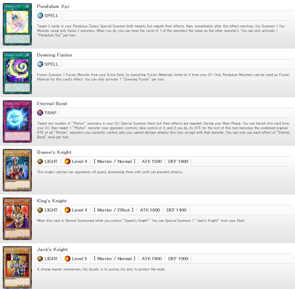 这张卡在手卡·墓地存在:可以从手卡以及自己怪兽区域表侧表示的卡之中把「王后骑士」、「国王骑士」以及「卫兵骑士」各1只送去墓地;这张卡特殊召唤。这张卡的攻击力上升双方手卡数量×500。可以丢弃1张手卡;对方场上和丢弃的卡种类(怪兽·魔法·陷阱)相同的表侧表示的卡全部破坏。