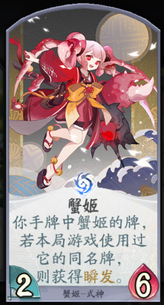蟹姬基础身材2/6,能力为你手牌中的蟹姬牌若本局游戏使用过:他的同名牌则获得瞬发,简单说就是,使用过1次后剩下的同名牌开始获得瞬发。基础能力让蟹姬拥有灵活的瞬发能力,重复的牌我们只要用一次后面都获得瞬发,让带蟹姬的阵容经常打出灵活的操作。基础身材2/6抗快能力特别出众,综合看蟹姬是基础身材和能力都非常优秀的式神。