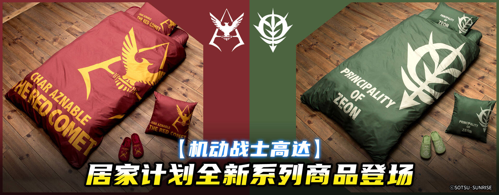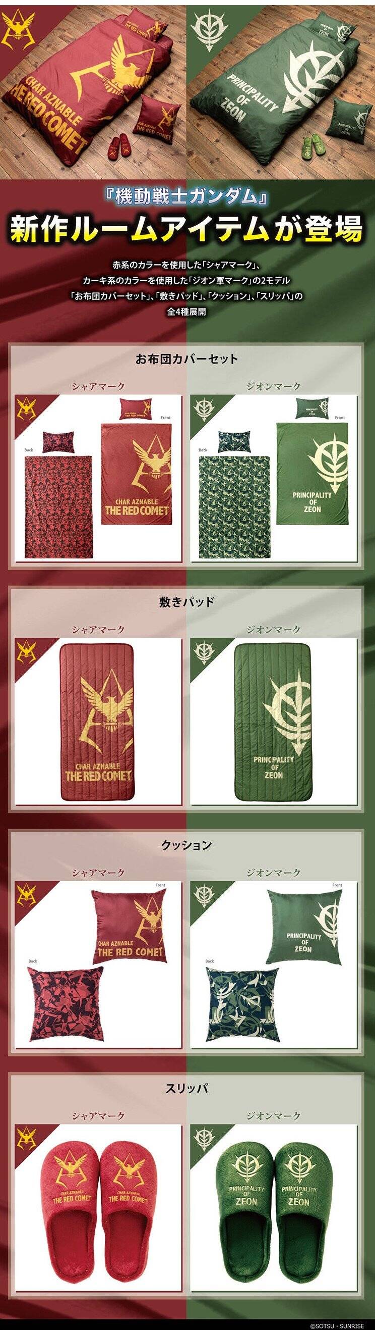 万代宣布推出《机动战士高达》居家计划全新系列商品,包括抱枕、薄床褥、床上两件套和拖鞋,每件商品都有夏亚和吉翁军两种配色。