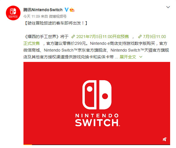 腾讯NintendoSwitch官方今天(6月29日)宣布,国行版Switch游戏《耀西的手工世界》将于2021年7月5日11:00开启预售,7月9日11:00正式发售,官方建议零售价299元。