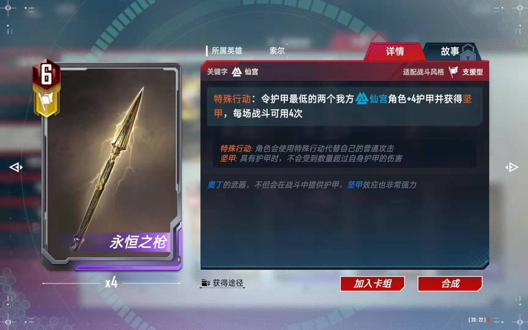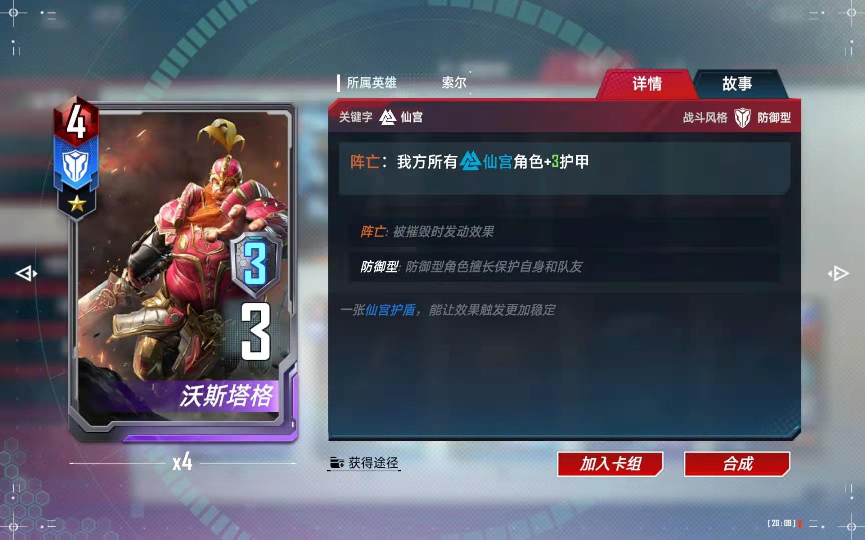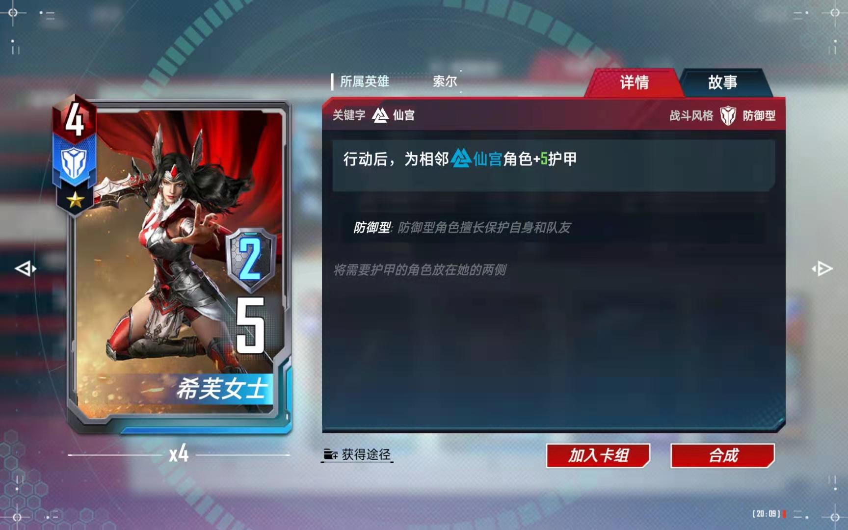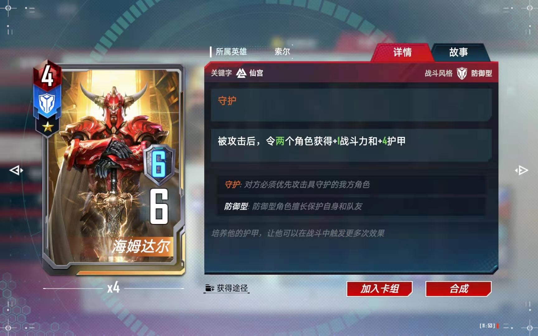 原技能:战斗内仙宫角色获得护甲时,自身+2/4/8战斗力;