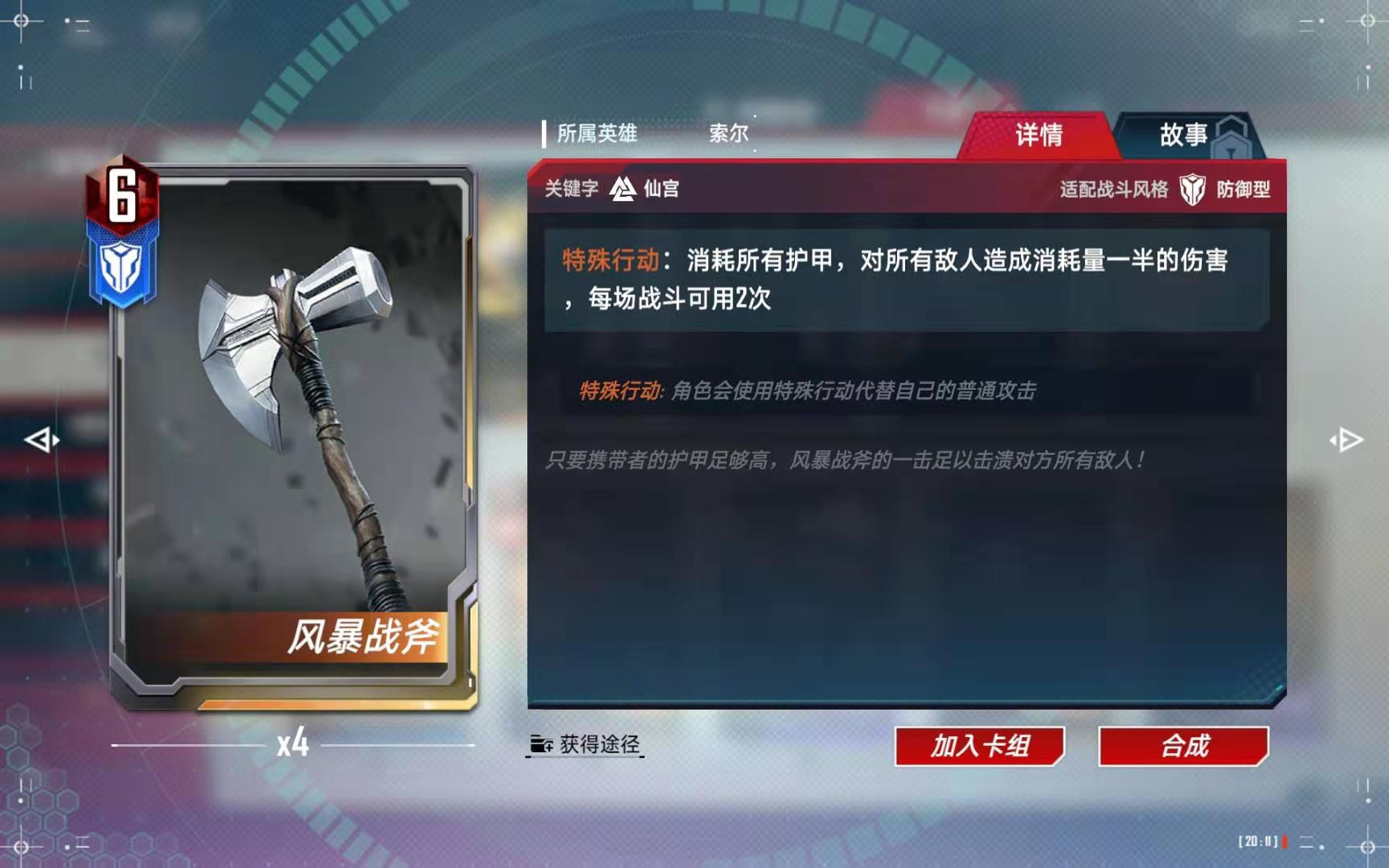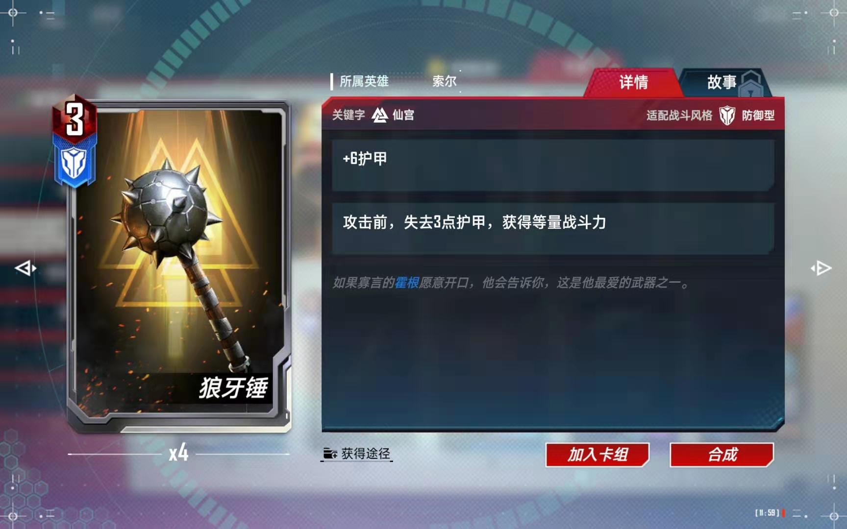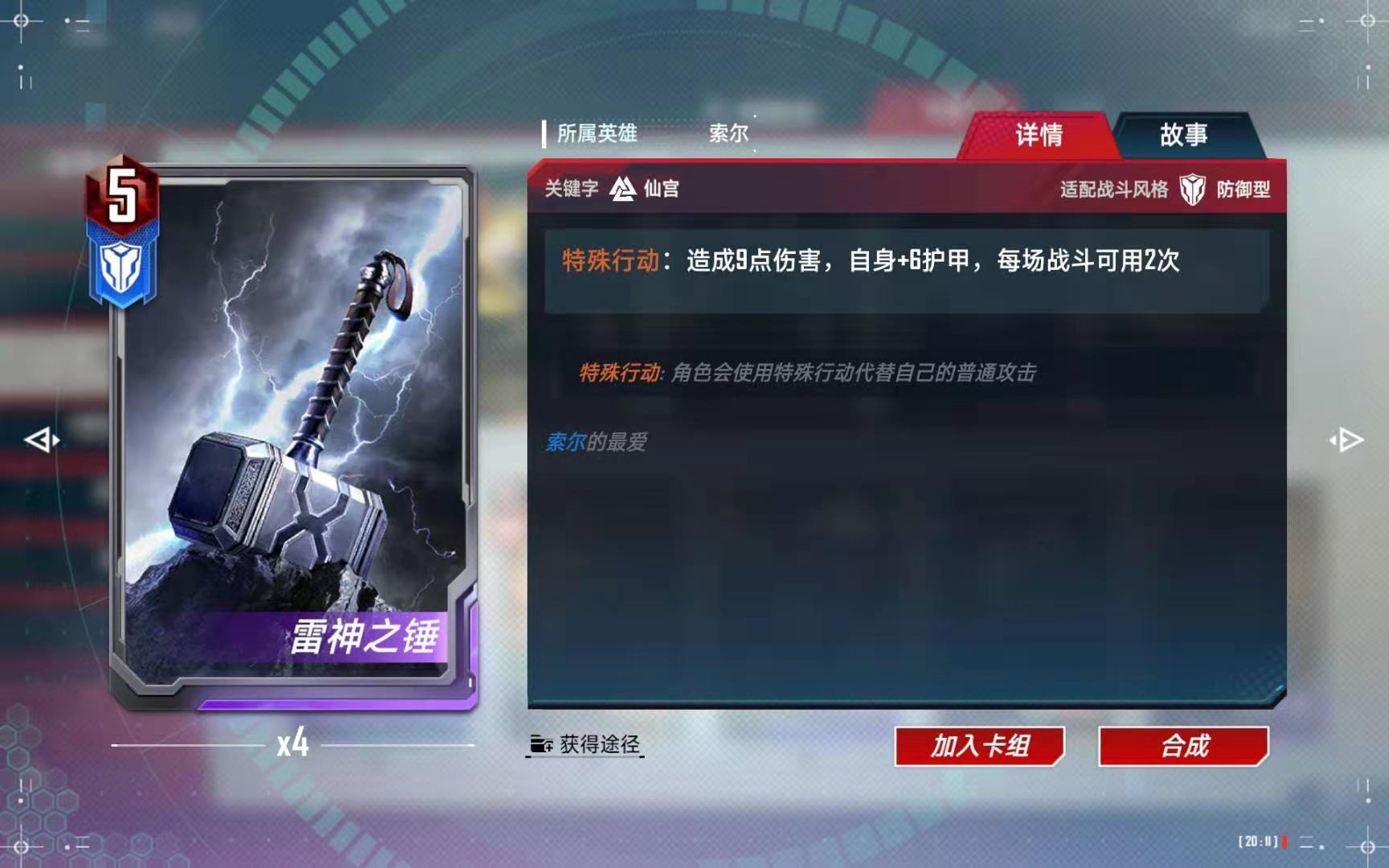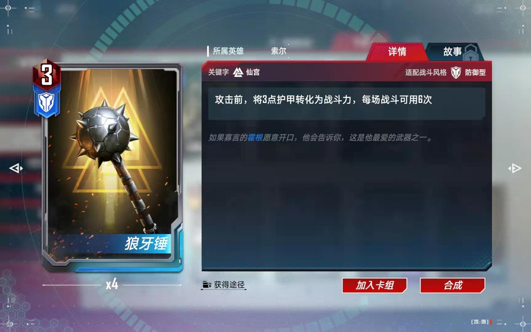 这张卡的改动还是很有意思的,关于这个“资格”,漫画中应该就是雷神、马面雷神、索尔娃、环视、美队、还有美队女朋友“简福斯特”这三个有资格了吧,简是二费,忽略她。在本游戏中,这张武器的意思应该是雷神、索尔娃、美队佩戴这个武器每回合都会成长6点护甲,改动还是挺有意思的。