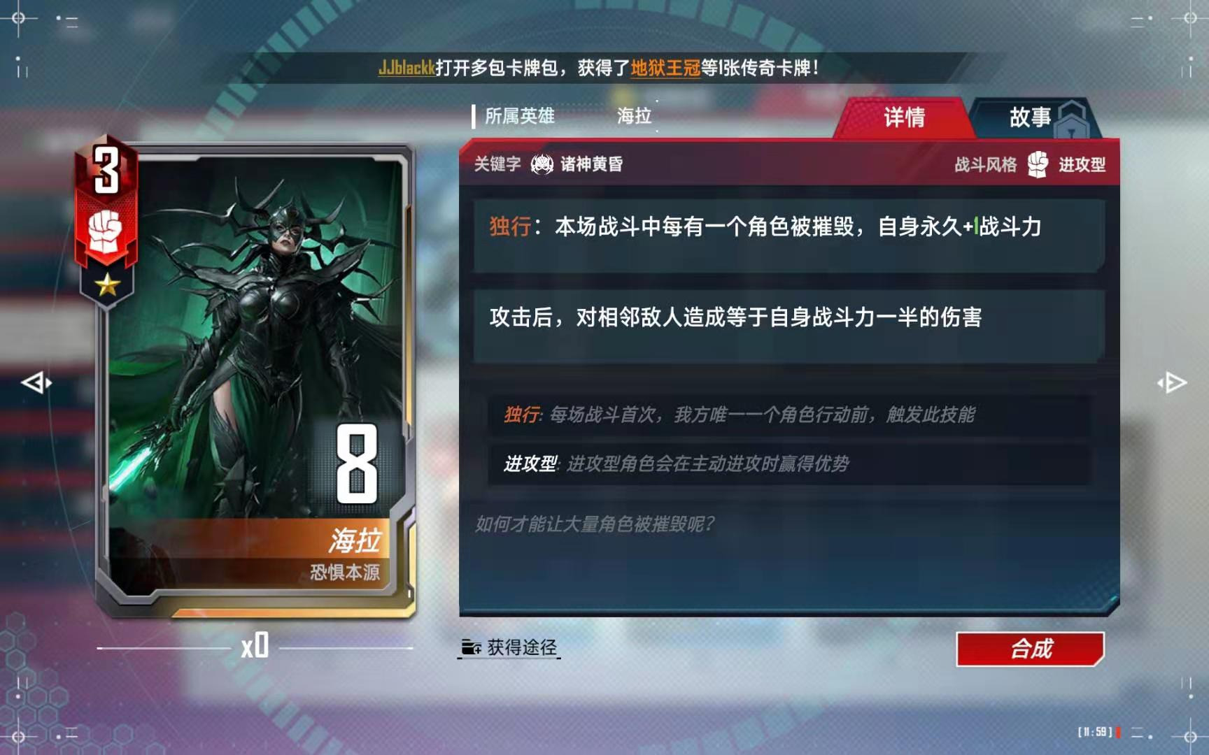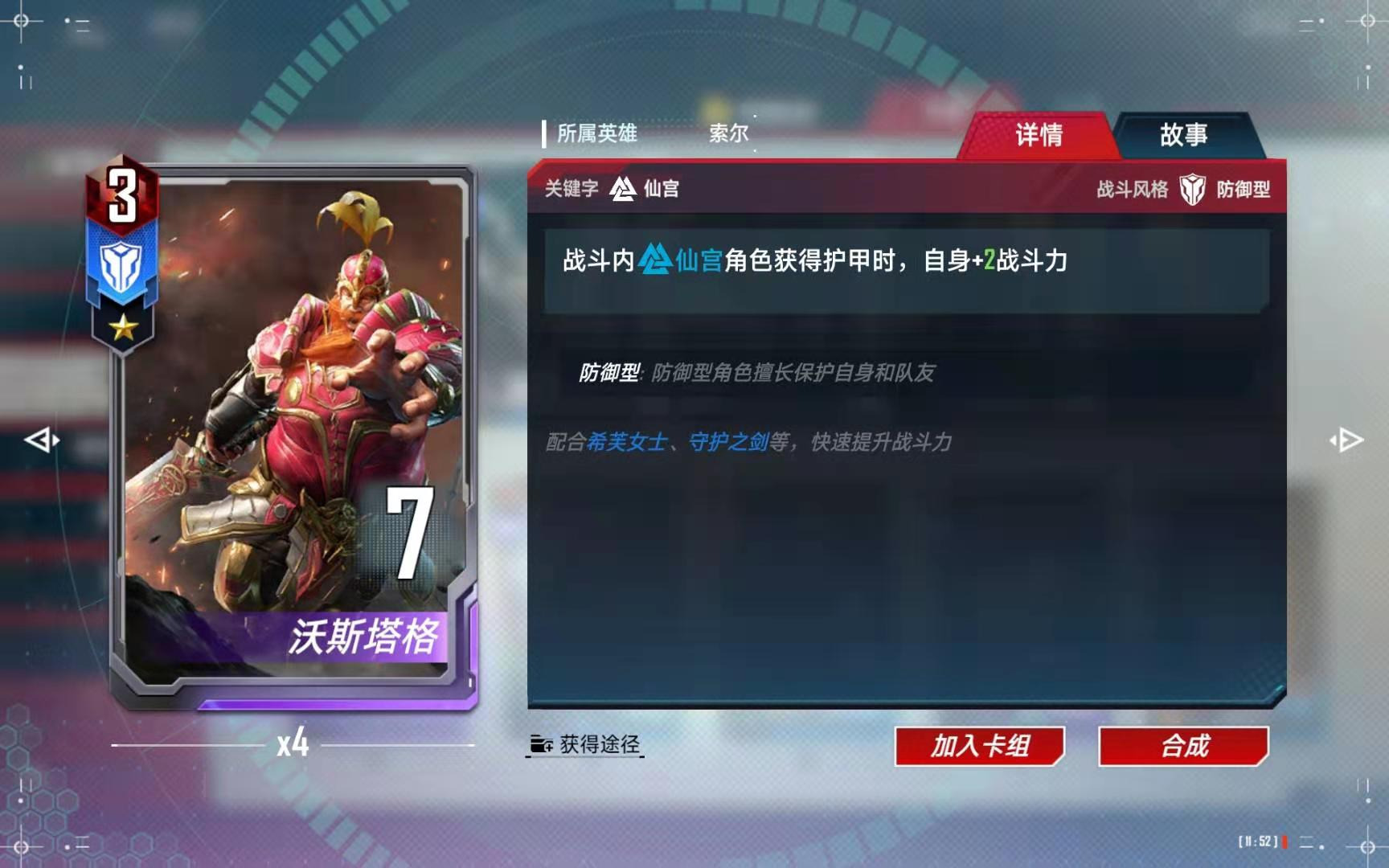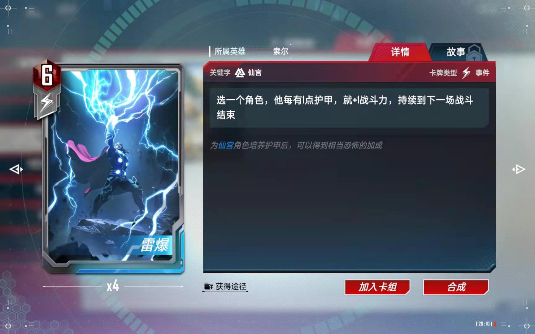 这张卡的改动还是很有意思的,关于这个“资格”,漫画中应该就是雷神、马面雷神、索尔娃、环视、美队、还有美队女朋友“简福斯特”这三个有资格了吧,简是二费,忽略她。在本游戏中,这张武器的意思应该是雷神、索尔娃、美队佩戴这个武器每回合都会成长6点护甲,改动还是挺有意思的。