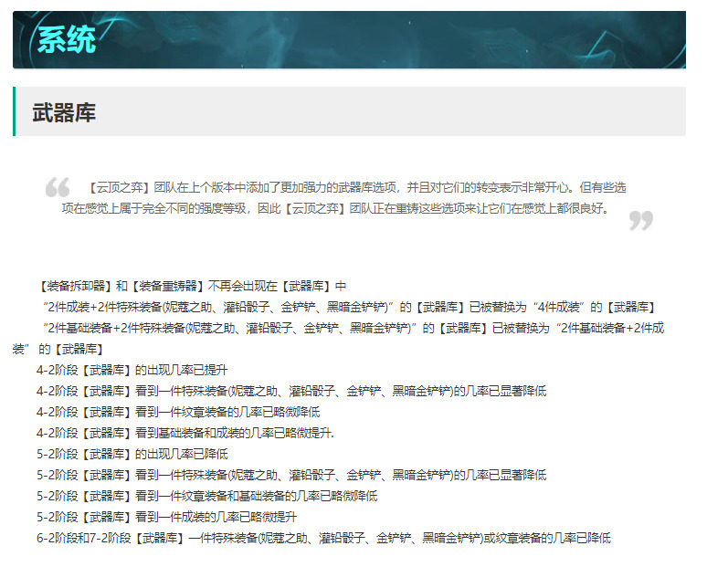 武器库改动:如公告中所说装备重铸器与装备拆卸器不在会在武器库中出现了,想获得这两件装备工具,只能在野怪阶段获得。武器库出现黑暗/白金铲子、妮蔻、骰子、转职装备概率降低,散件与成品装备提升,这样改动让后期对局更加平衡,合成自然之力或利用骰子、妮蔻合成4-5费2星概率**降低。