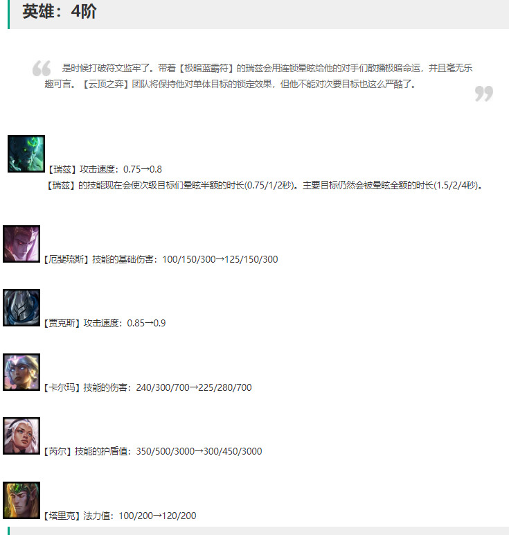 芮尔削弱,1星与2星护盾削弱,坦度下降,在非圣光和铁甲羁绊加成下坦度下降及其严重。
