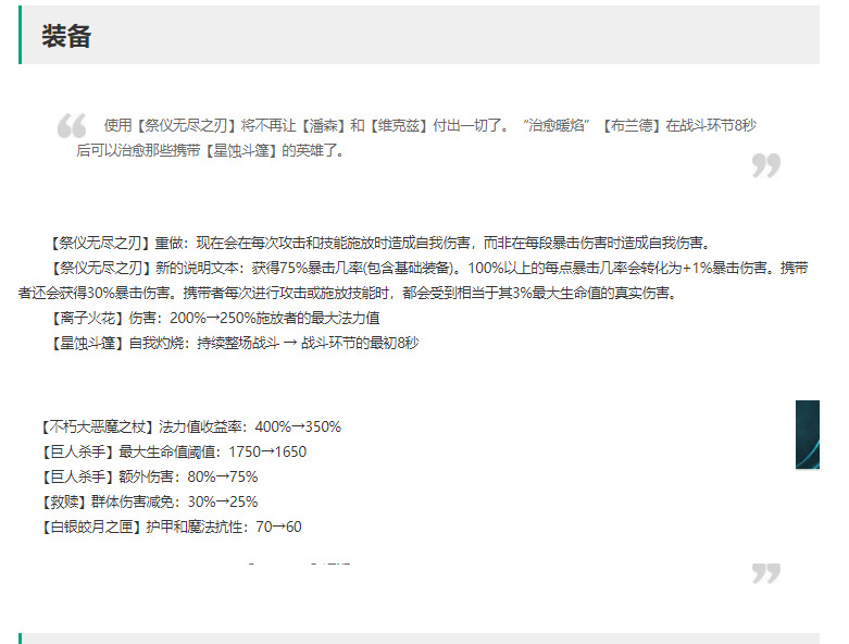 武器大幅度增强,初始攻速增加,让武器技能增加的攻速更多,搭配这版本增强的6神盾羁绊武器重获新生。