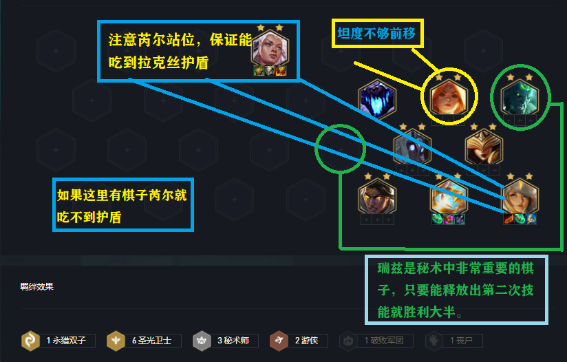 关键羁绊:6圣光+3秘术。阵容主C大眼,副C拉克丝,主坦芮尔。