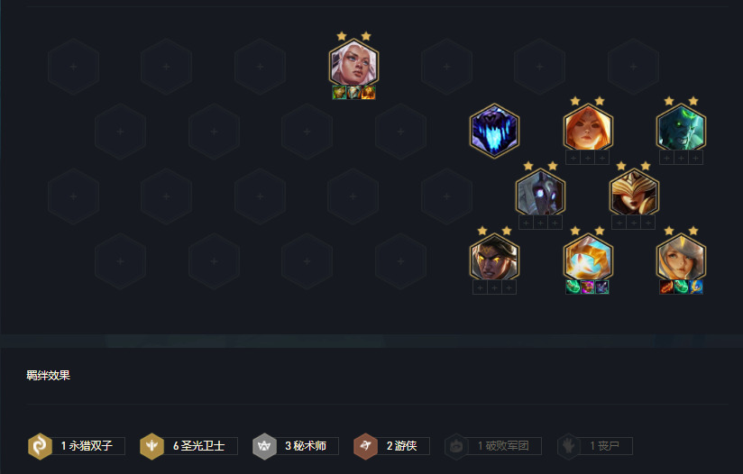 在6圣光阵容中,大多时候韦鲁斯是能与千珏组成2游侠羁绊,通常不与出装,通常6圣光主要以大眼、拉克丝、辛德拉、天使为输出点;