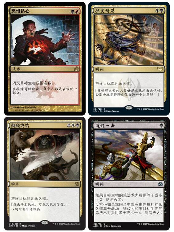 因为尼米捷这套牌基本上前几回合几乎不做事,在面对快攻套牌时会相对弱势,所以这套牌也是使用了大量的去除和扫场,以做到延缓对面的攻势以及返场。因为尼米捷的原因这套牌的单解基本上都是选择了2费的双色去除,老牌强力单解恐惧钻心,以及STX新补强的驱灵诗篇都是不错的选择,一般这两张合计会带6-7张的样子,然后会再带一张万能单解彻底终结。而80张的版本因为有更多的卡位且更惧怕快攻和猛袭套牌,会在主牌携带一定数量的送终一击来增强抗性。
