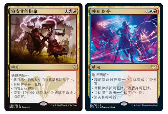 同时还有一些具有一部分去除能力的多功能单卡,比如寇安甘的指命,粹丽指命等这种可以多项选择的牌也是尼米捷里比较常见的单卡。这两张牌各有千秋,比较常见的是红黑指,除了能打2的同时还有着手牌破坏,砸神器以及回收资源的能力,而红蓝指有着相同作用的打2和砸神器以外还有滤牌和出珍宝的效果,可以有效滤掉手里不需要的牌去抓取资源,珍宝也可以用于调色,更多的会在80鸟版本里使用来弥补稳定性。