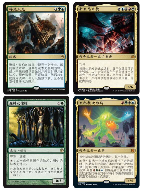 得见天光和新生尼米捷这两张牌就是组成了这套天光尼米捷的核心单卡,得见天光可以支付五种颜色的法术力从牌库中找一张5费及以下的生物,法术,瞬间牌免费施放,可以根据当前的场面从牌库中施放最适合的咒语,所以也使得这套牌工具箱构筑的成立。而新生尼米捷本身超模的身材,优秀的进场异能可以补充大量的手牌,同时5费也可以被天光直接导出来并赚取大量资源,也是将这套牌的构筑变得极其工具箱的主要原因之一。