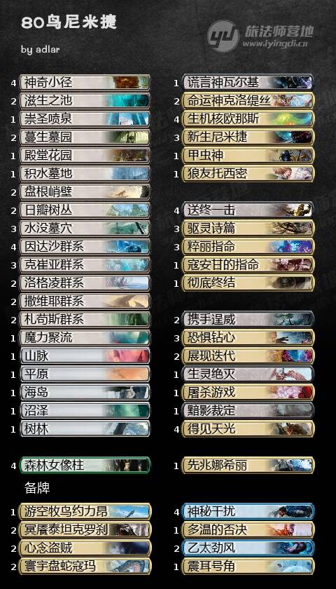 除此之外其实还有非常多的选择,所以说尼米捷这套牌在每个人的手里都不一样,我甚至还见到过带世界树加一堆双色神的版本,天光和尼米捷这两张牌给了套牌极大的构筑自由度,可能这也是这套牌常年在meta上占有一席之地的原因吧。