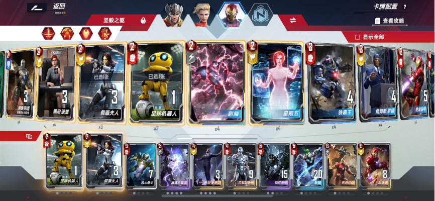 看下面的图,上面是你有的牌,下面是卡组。最右边的钢铁侠底下1个圆点,就是只放了一张,只能买一次。
