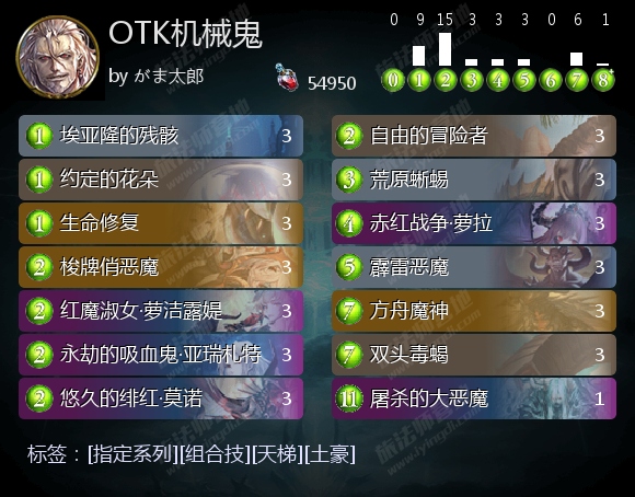 第7回合OTK是机械鬼的主要游戏计划。在未复仇状态下使用方舟魔神,然后使用悠久的绯红·莫诺,用生命修复融合机械牌,最后使用修复,便可以满足莫诺的自动进化条件,使场上随从全部进化,并跟着莫诺一起打脸。