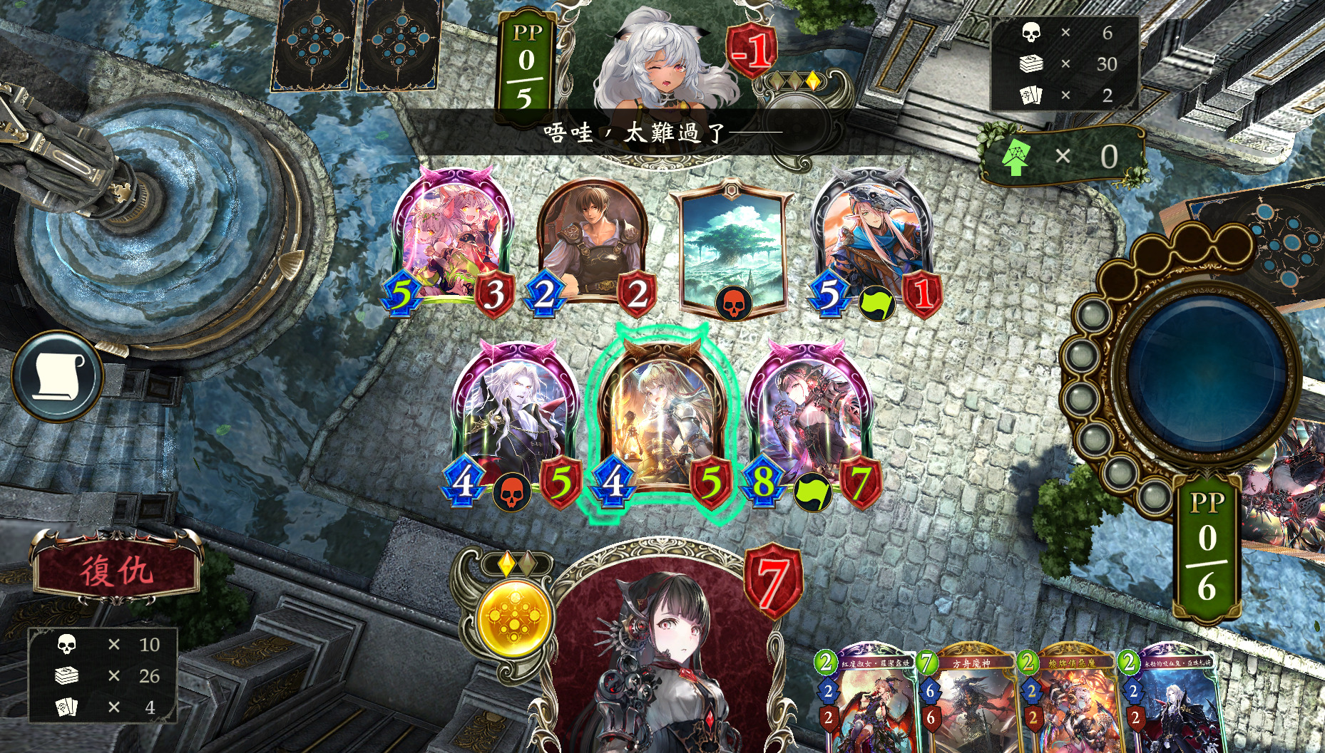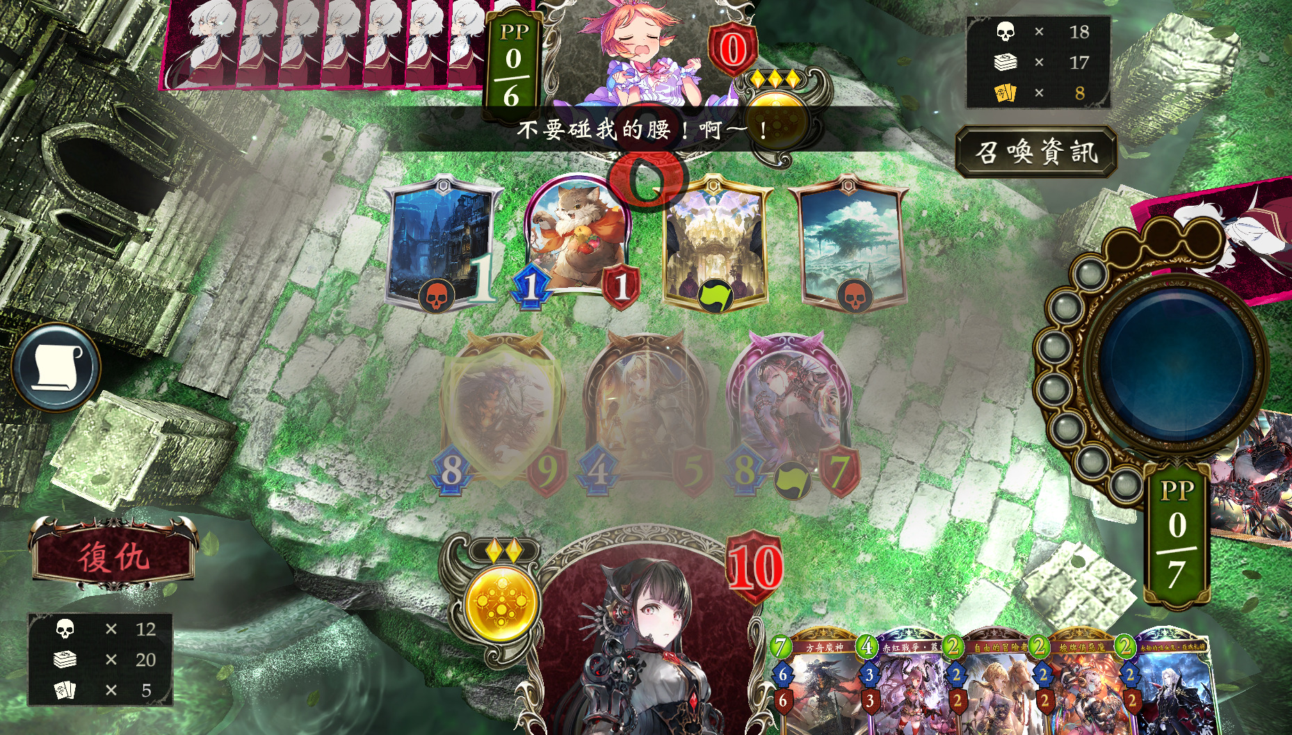 留意手牌数。注意考虑场上残骸和花朵的效果,霹雷恶魔的进化时效果,以及复活的亚瑞札特是否会制造血红獠牙。手中组件不齐的话,尽量避免爆牌。可以通过修复的融合效果减少手牌数。此外,第5回合以后手牌过多的话,慎用花朵。