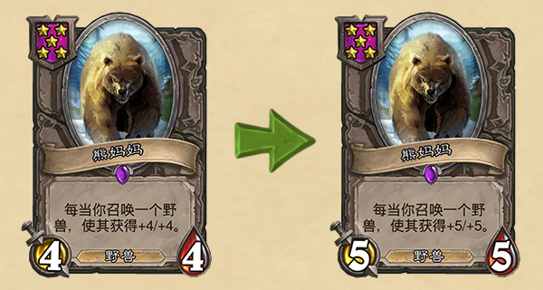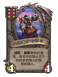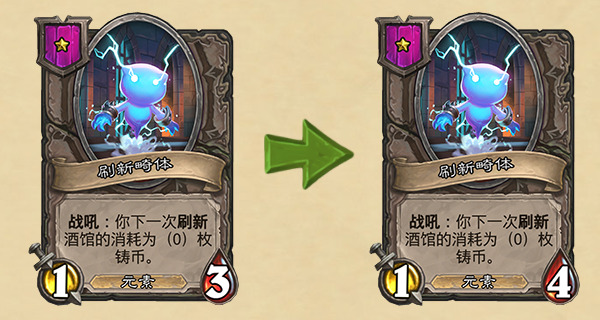 - 6星4/4,战吼:刷新鲍勃的酒馆,使其中的随从变为你的多数随从的类型的随从。