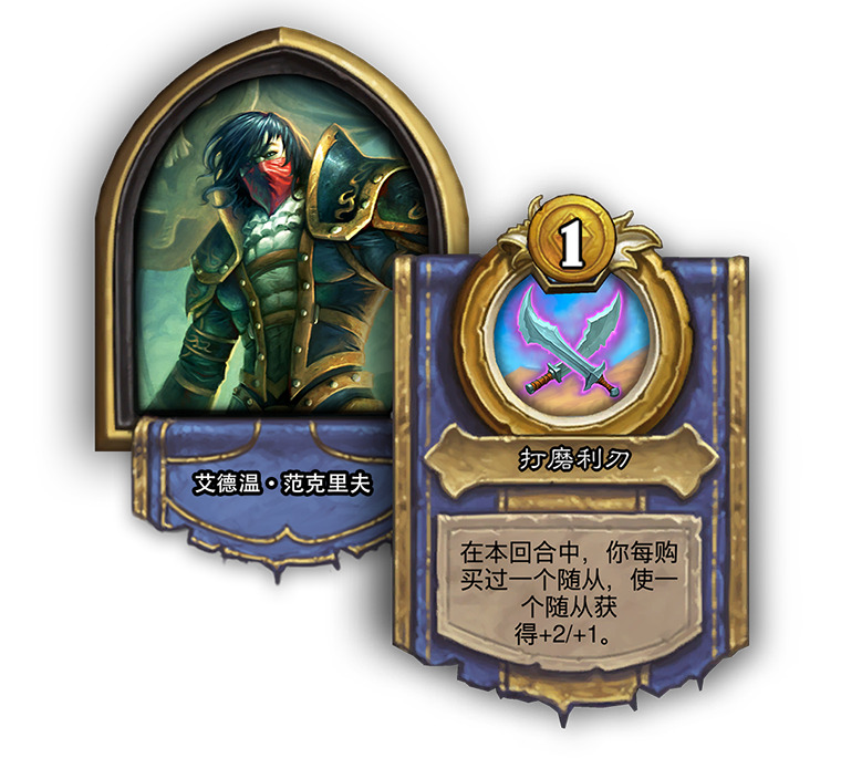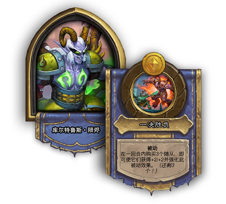 1. 在一回合内购买3个随从,即可使它们获得+2/+2并强化此被动效果;