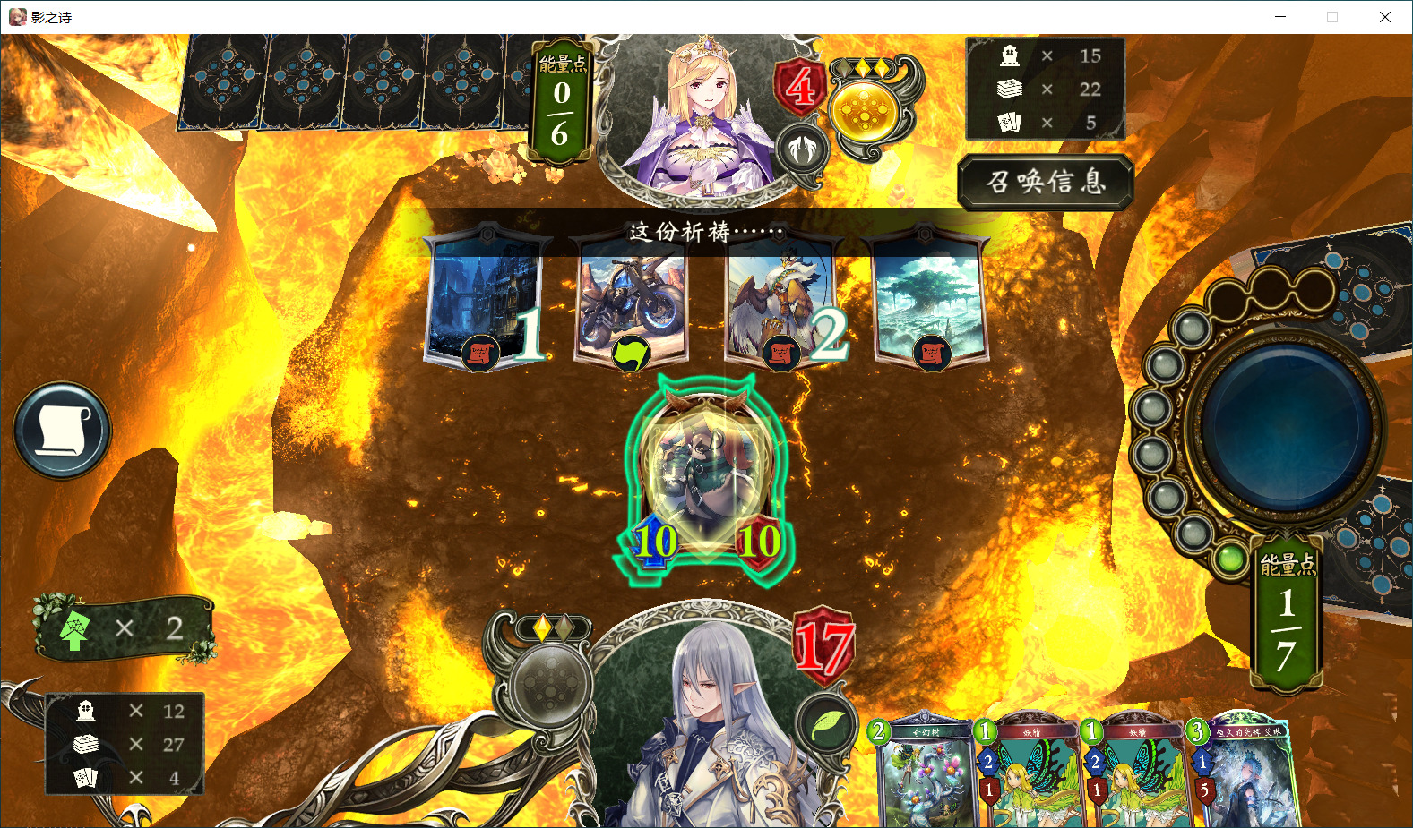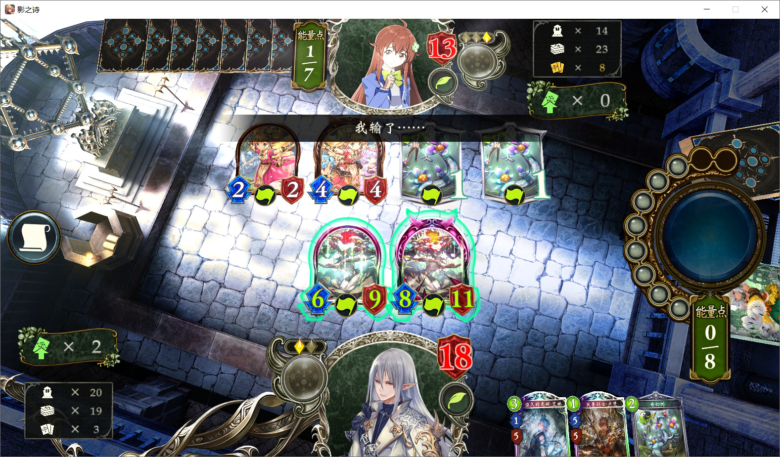 如图,上回合对面妖精盛宴铺出守护异种的大场面,然后被人马进化一波清掉,对面手牌告急且无进化点返场,选择投降。