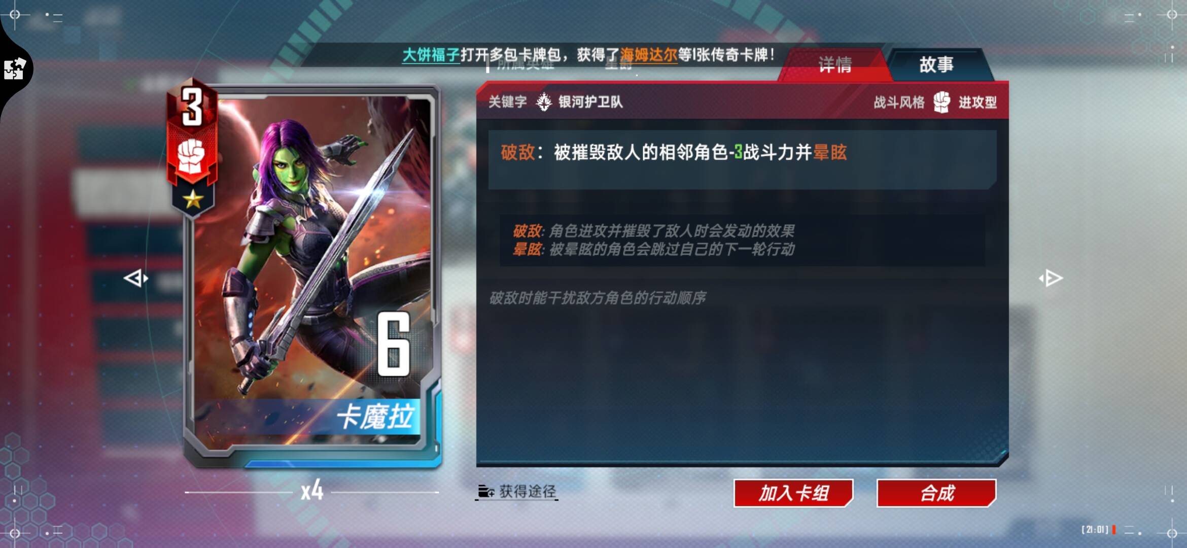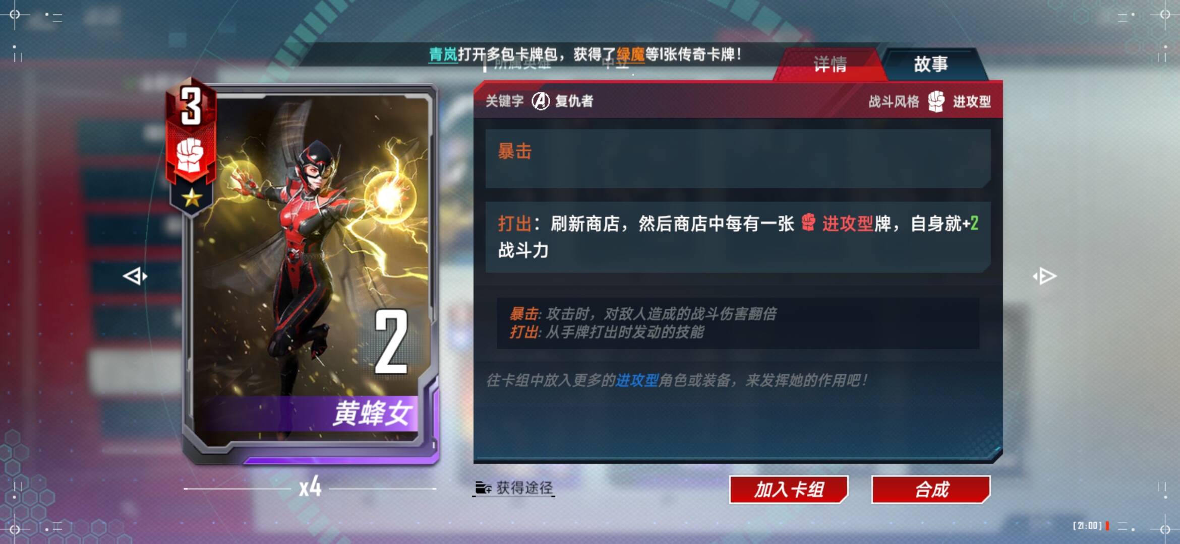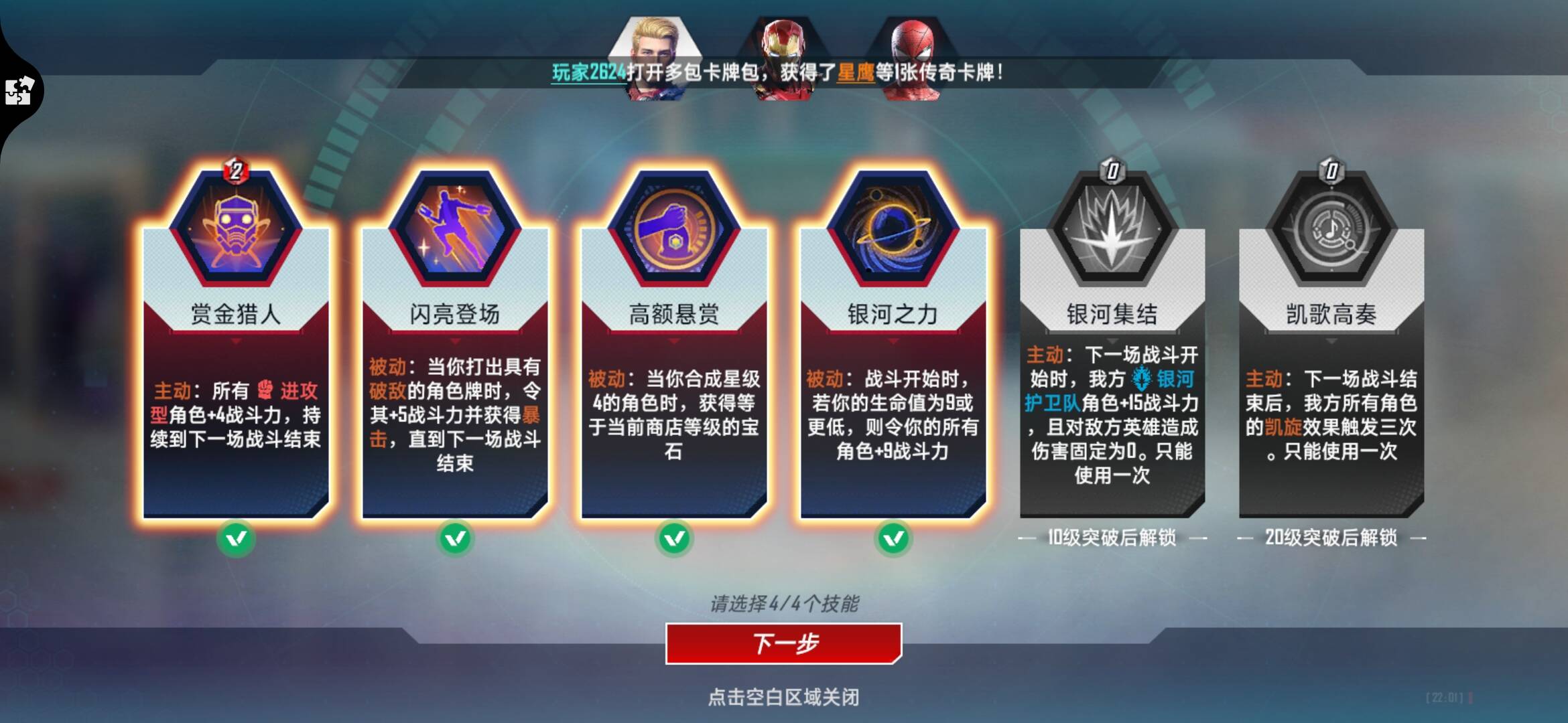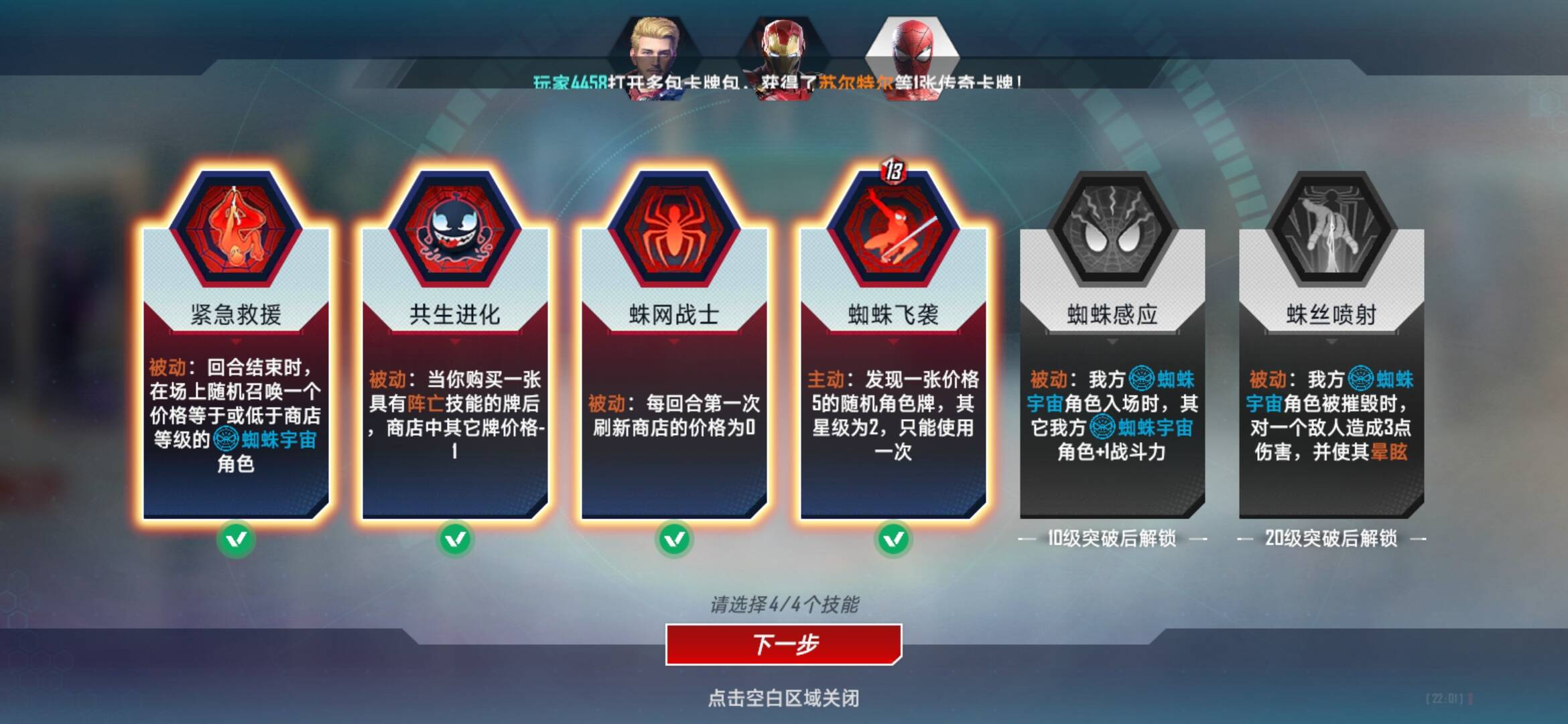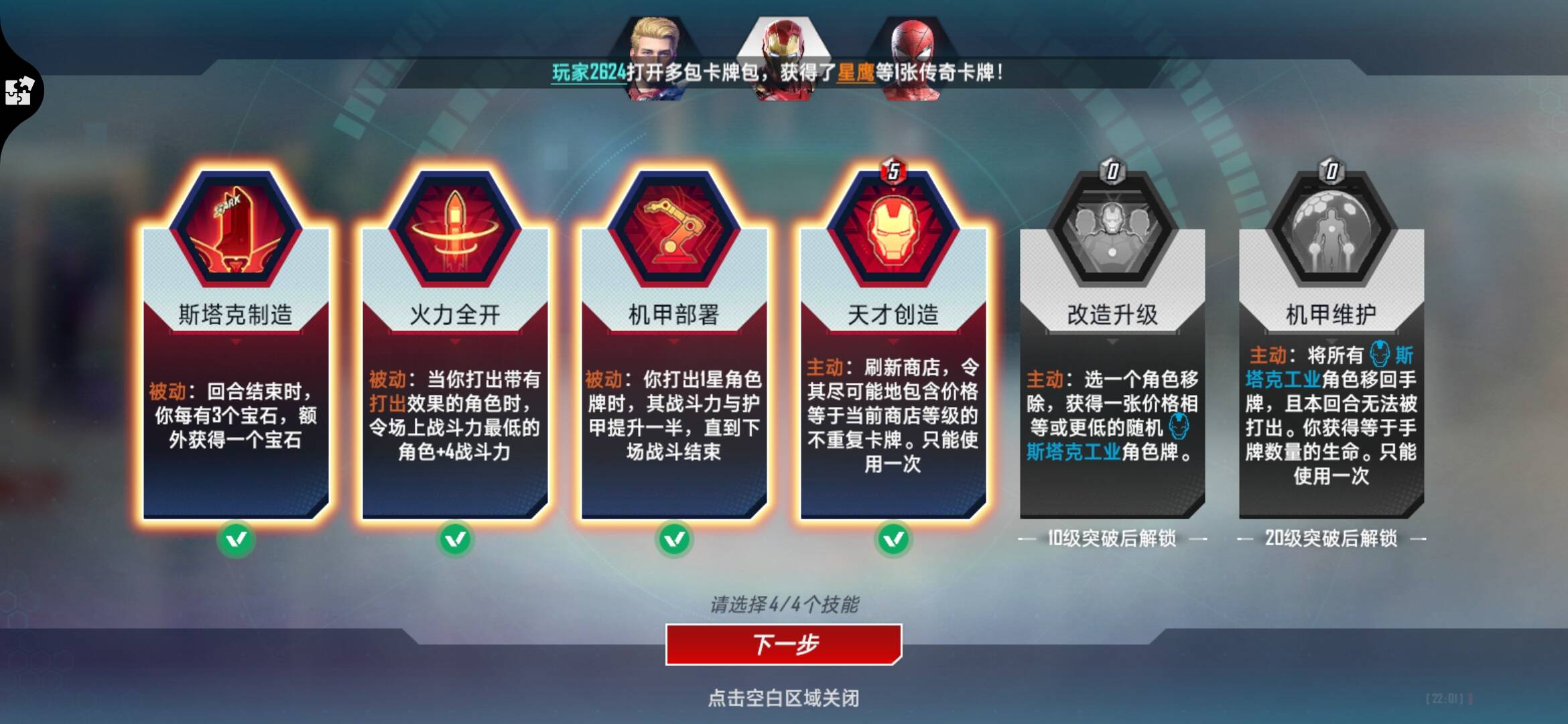- 送4宝石的天才创造:三选技能。本质是一个定向检索技能,在五级商店时使用能大概率刷新到红浩克和两张蜘蛛侠、钢铁侠穿甲剑等等,能较快拿到核心。