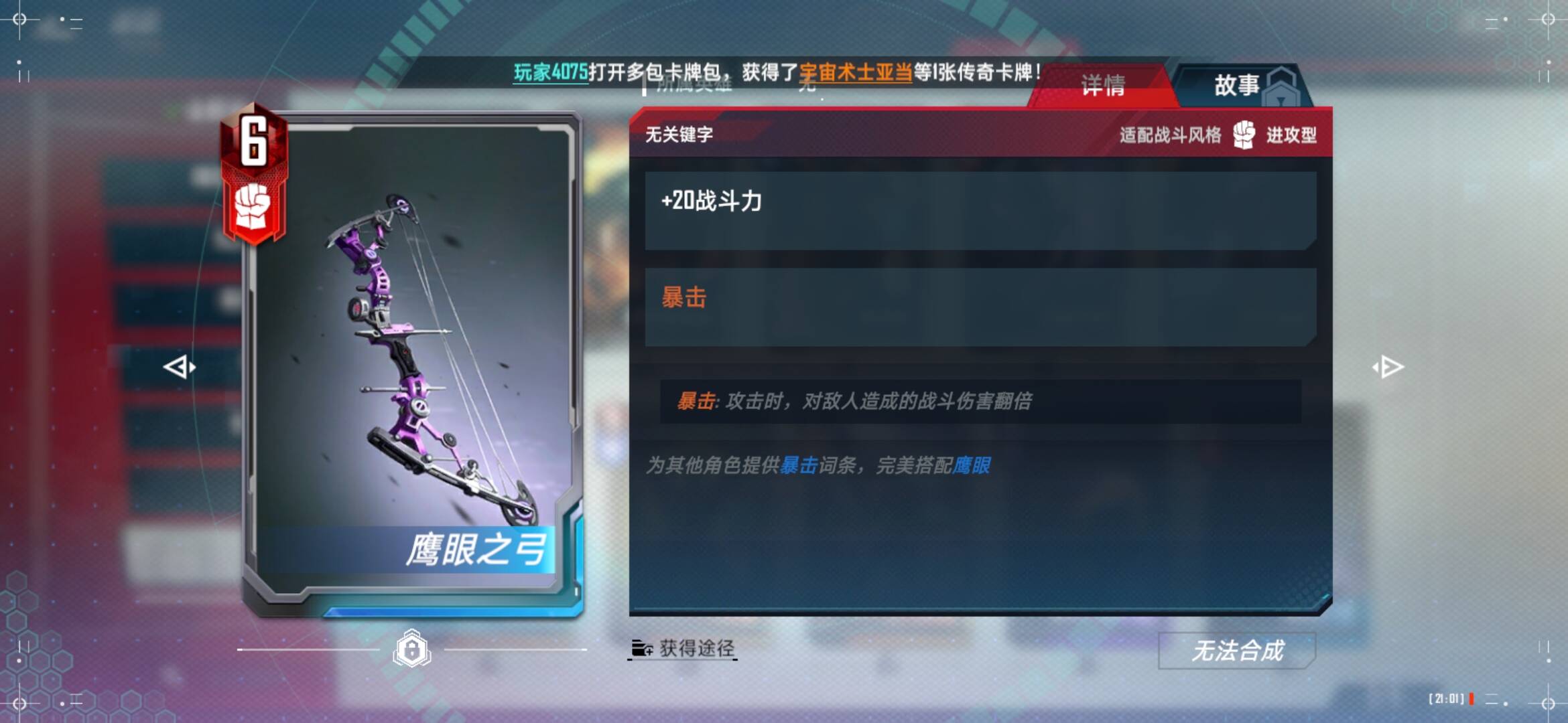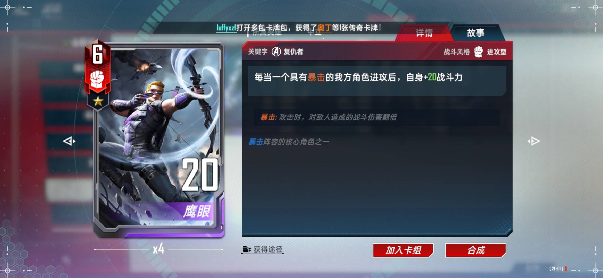 - 鹰眼之弓:4张,后期核心装备。同样是锁定池卡。这张卡提供了非常宝贵的暴击词条,在本卡组中主要佩戴给卡魔拉、德拉克斯、勇度、红浩克、鹰眼,不仅能避免被恶形怪眩晕,还能帮助叠加鹰眼身材。