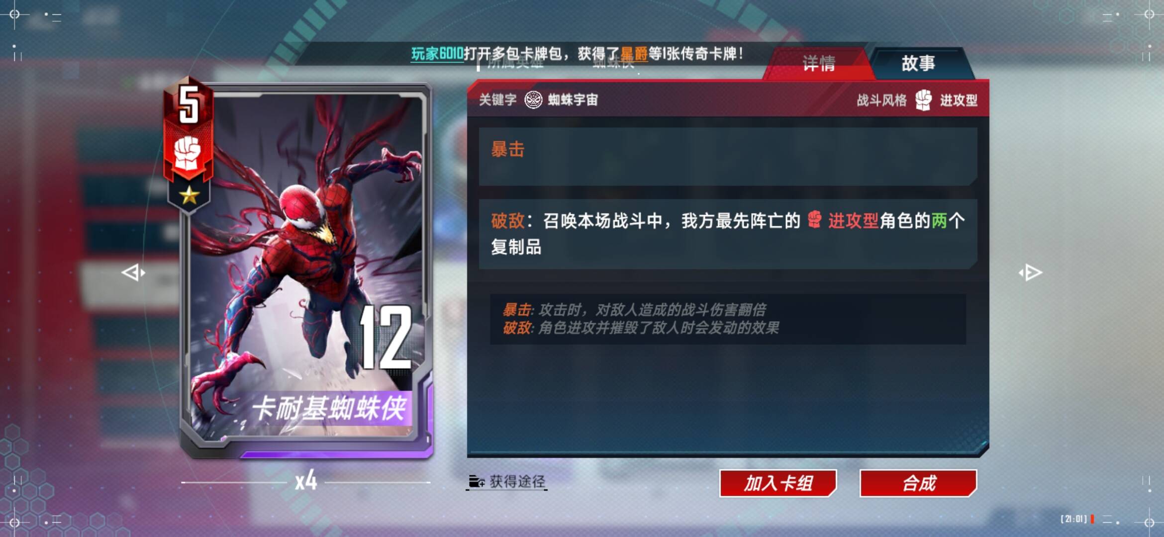- 卡耐基蜘蛛侠:4张,卡组中后期核心。低配2张就能玩,星级并不重要,和共生体蜘蛛侠一样,本卡组中要的主要是他的暴击词条。另外他的破敌效果也能为本卡组提供返场能力。