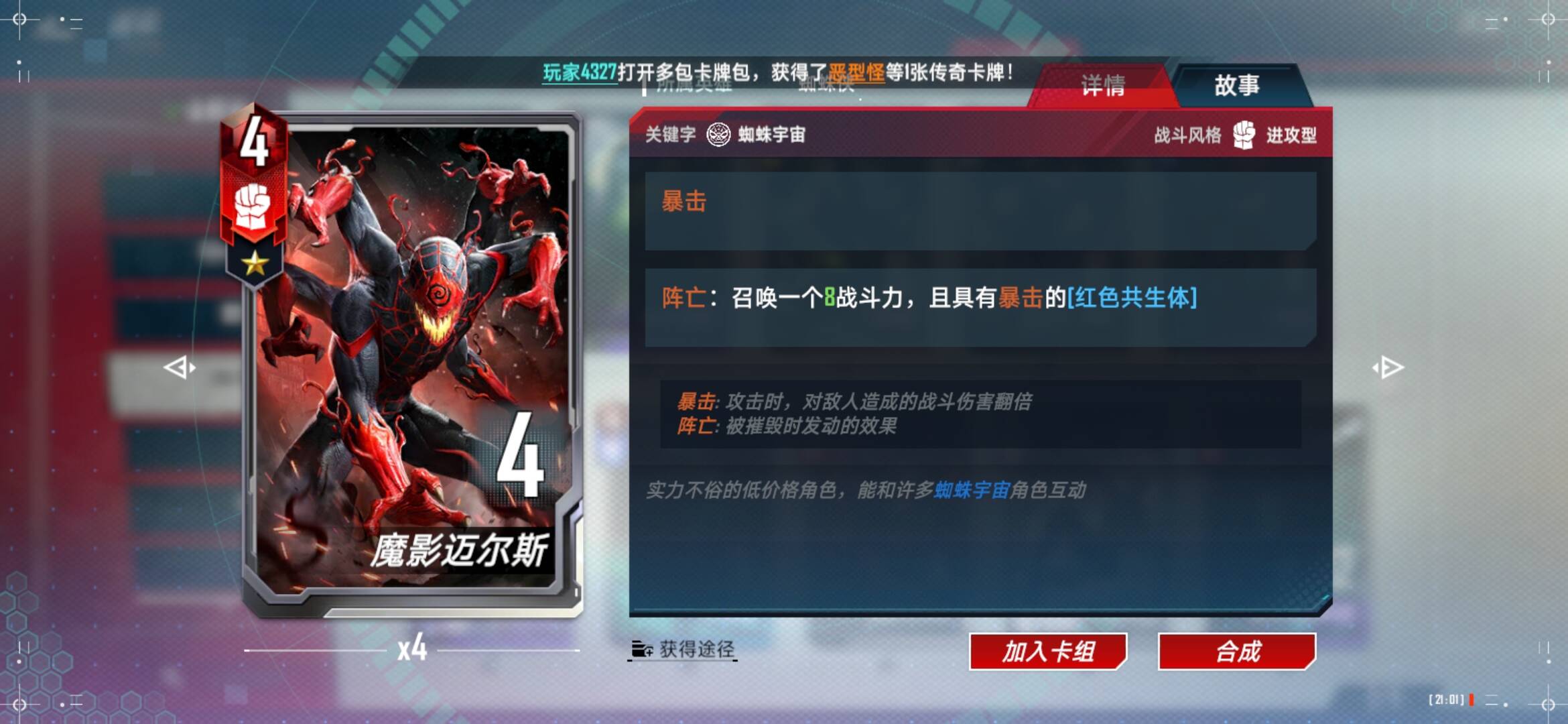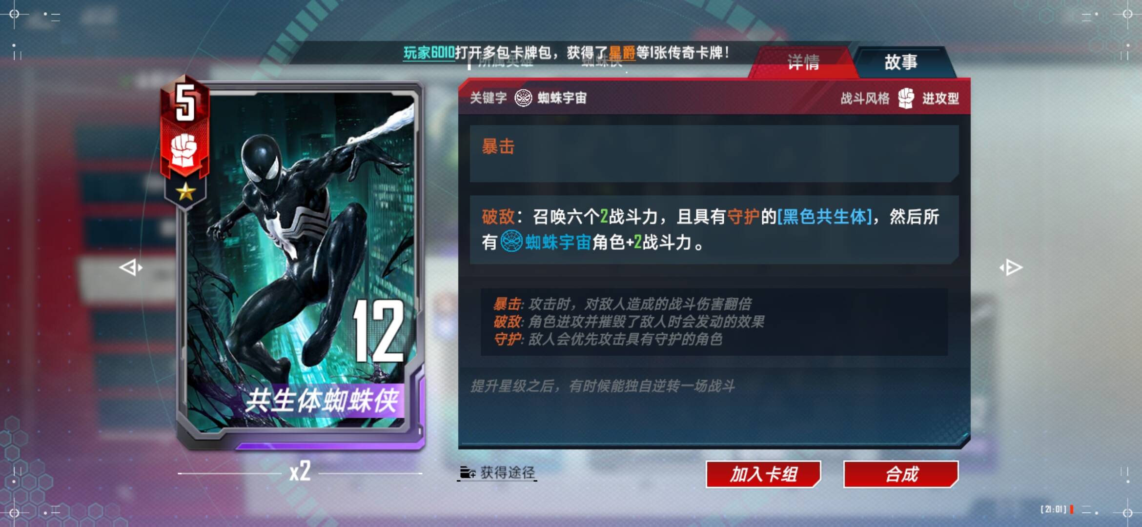 - 共生体蜘蛛侠:4张,卡组中后期核心。低配2张就能玩,星级并不重要,拿到红浩克之后就算是一星黑蜘蛛也会有高额的攻击力,本卡组中要的主要是他的暴击词条。