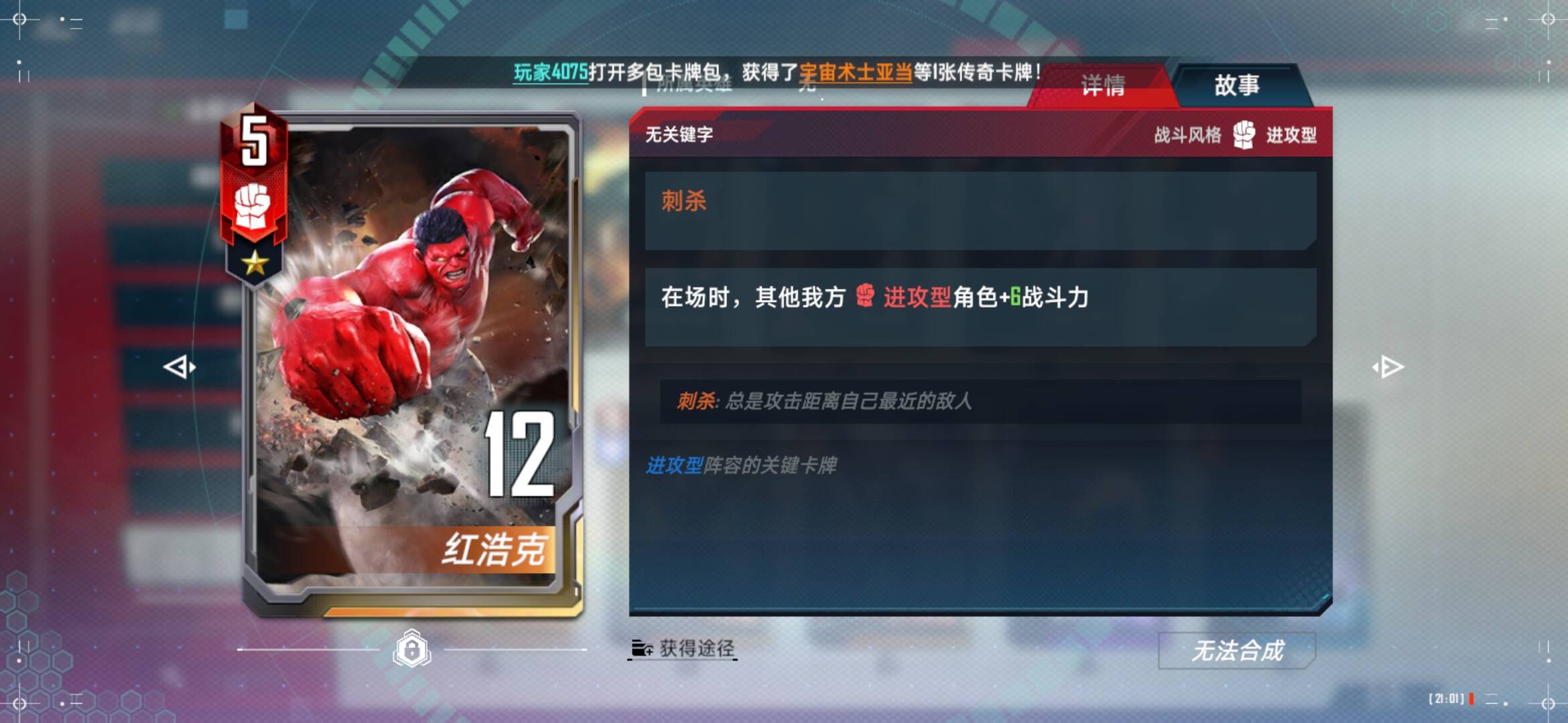 - 红浩克:4张,卡组绝对核心之一。锁定池附赠橙卡,在大家的橙卡都不全的情况下,满配四张红坦克将会给你的带来天然的巨大优势。四星红浩克能够为每张红卡提高24点战斗力,对于全红队伍更是能提供5*24=120点的巨额加成。