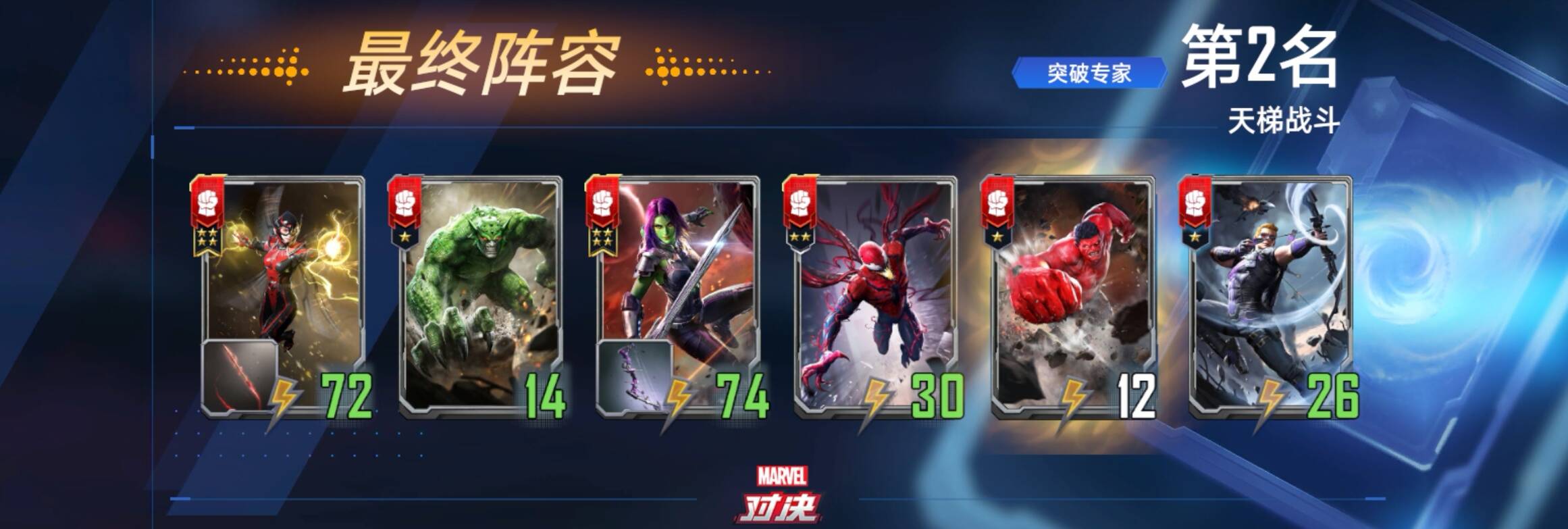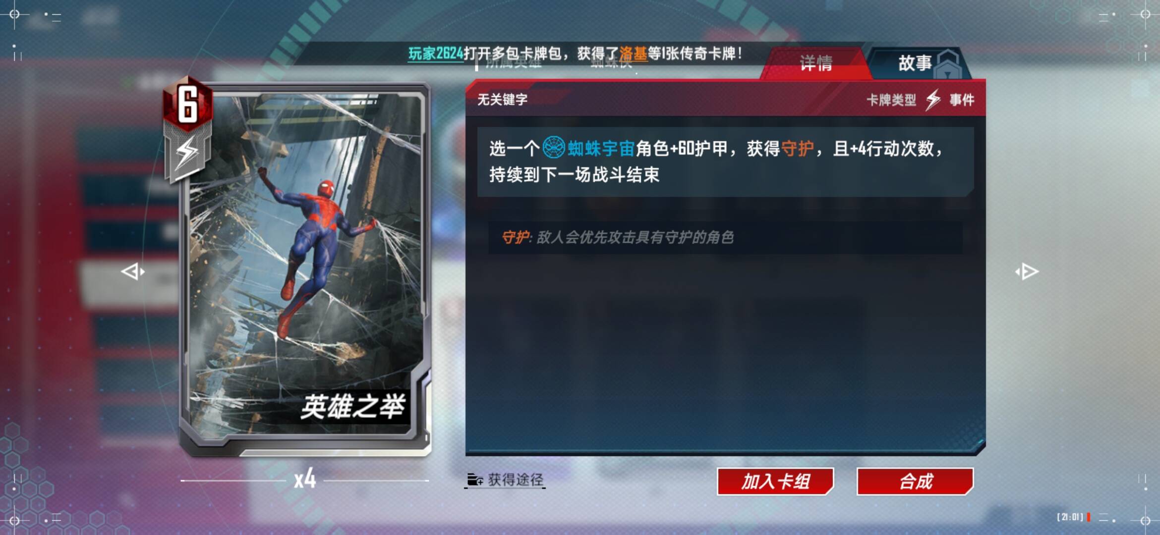 - 英雄之举。可选卡牌之二。增加护甲的同时增加行动次数,后期对共生体蜘蛛侠或者卡耐基蜘蛛侠使用这张卡,第一能连续攻击破坏敌方构筑,第二增加的60护甲能保持蜘蛛侠的攻击力不会下降过快,第三能快速为鹰眼叠加攻击力。在本卡组中非常不错的一张卡。