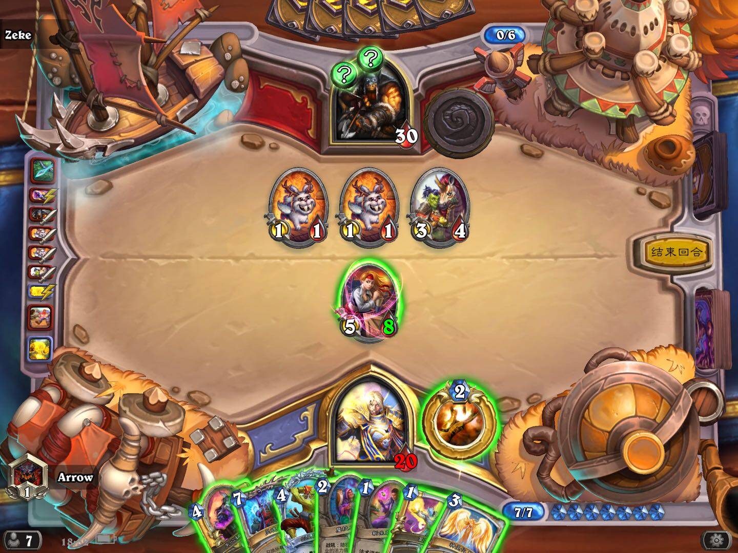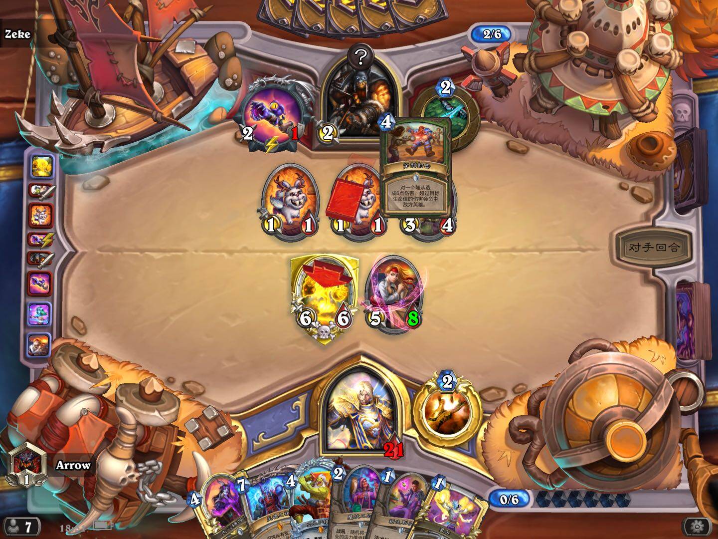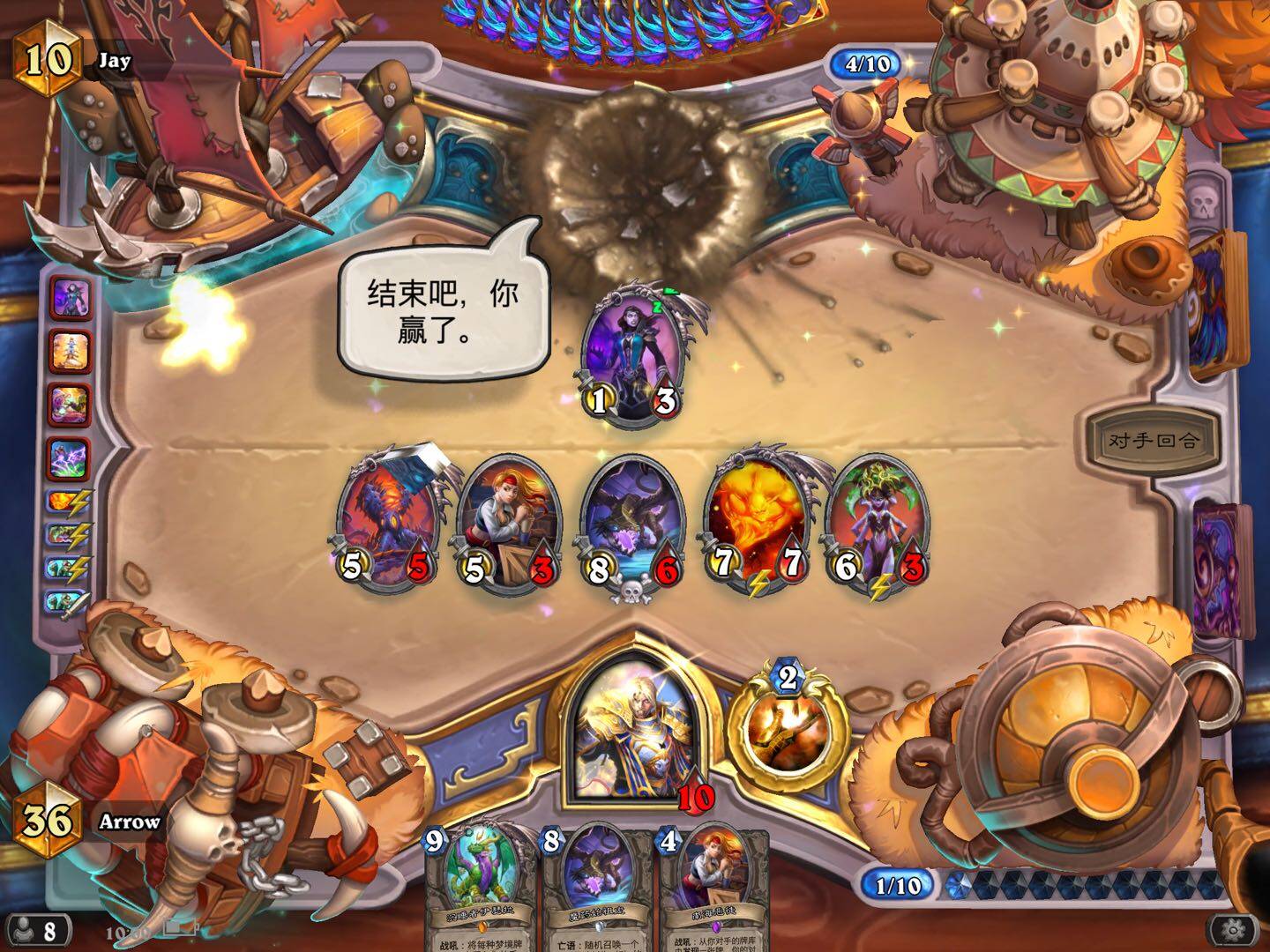 防战:怎么贪怎么厚就怎么玩,不过要小心南海海盗爆牌,此对局中我们是绝对的进攻方,虽然战士解牌很多,但他过牌手段有限,而且甚至为了疲劳会硬不过牌,所以我们不断的压场面,是极有可能踹死对手的。