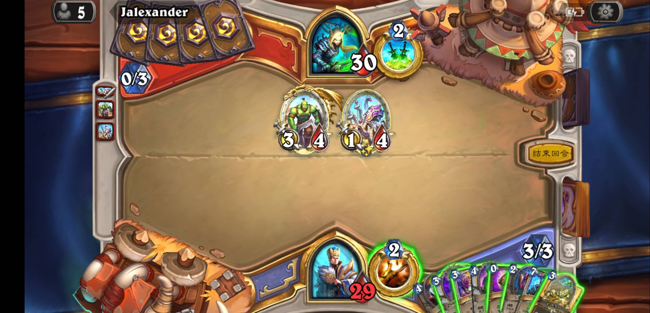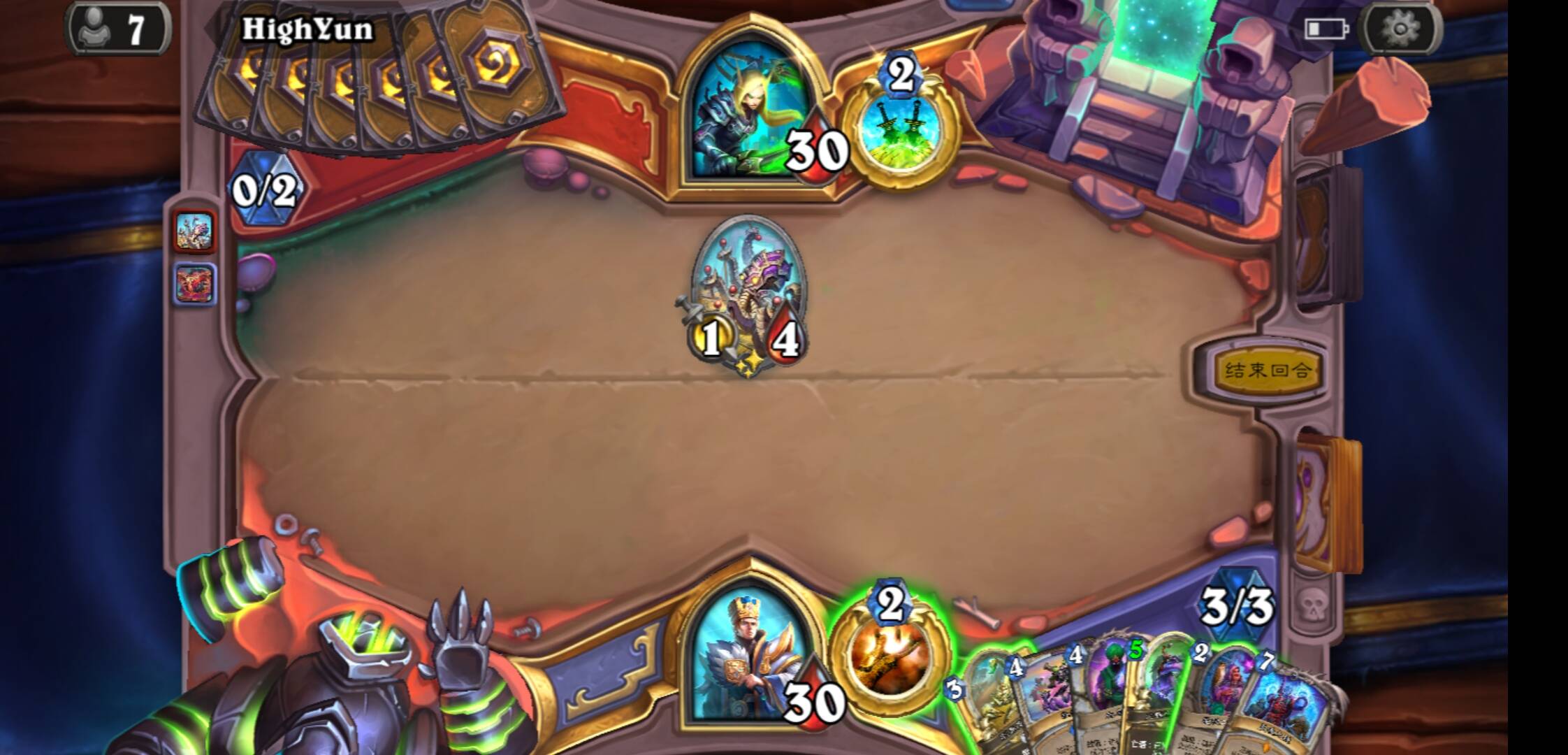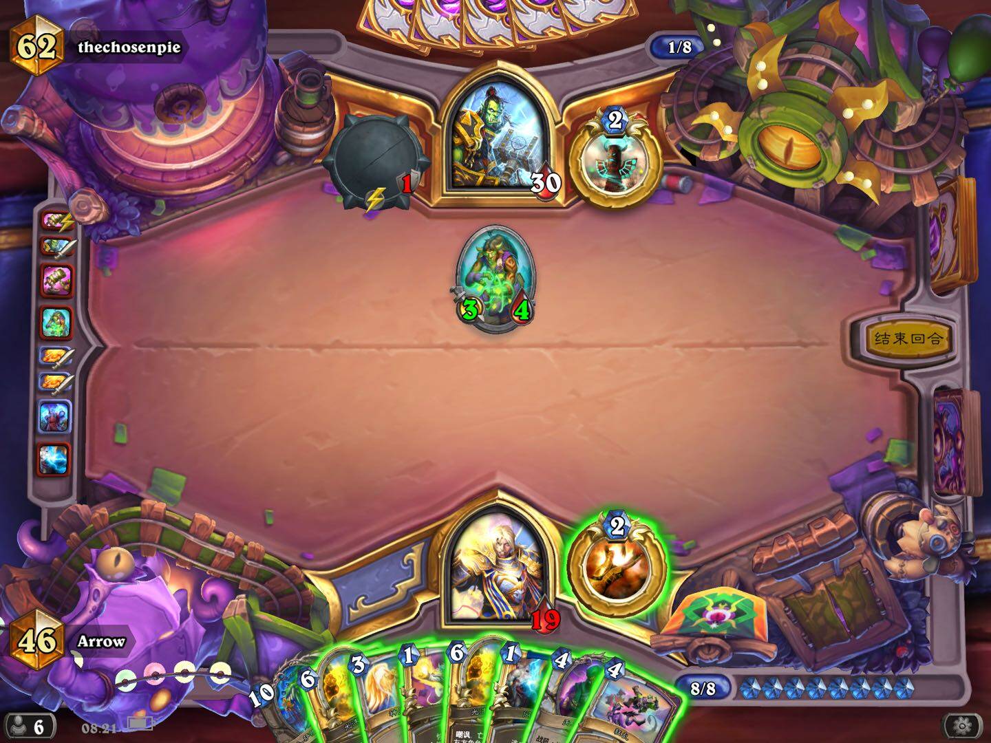 大家可以从左侧看出,对面的萨满在上回合中未使用任何元素,此时,是我们拍下光沐元素的最好时机(大家也可以从我的手牌和费用中看出,即使我手中有双光沐元素,在六费的时候我也没有拍,就是为了防对面的池塘)。