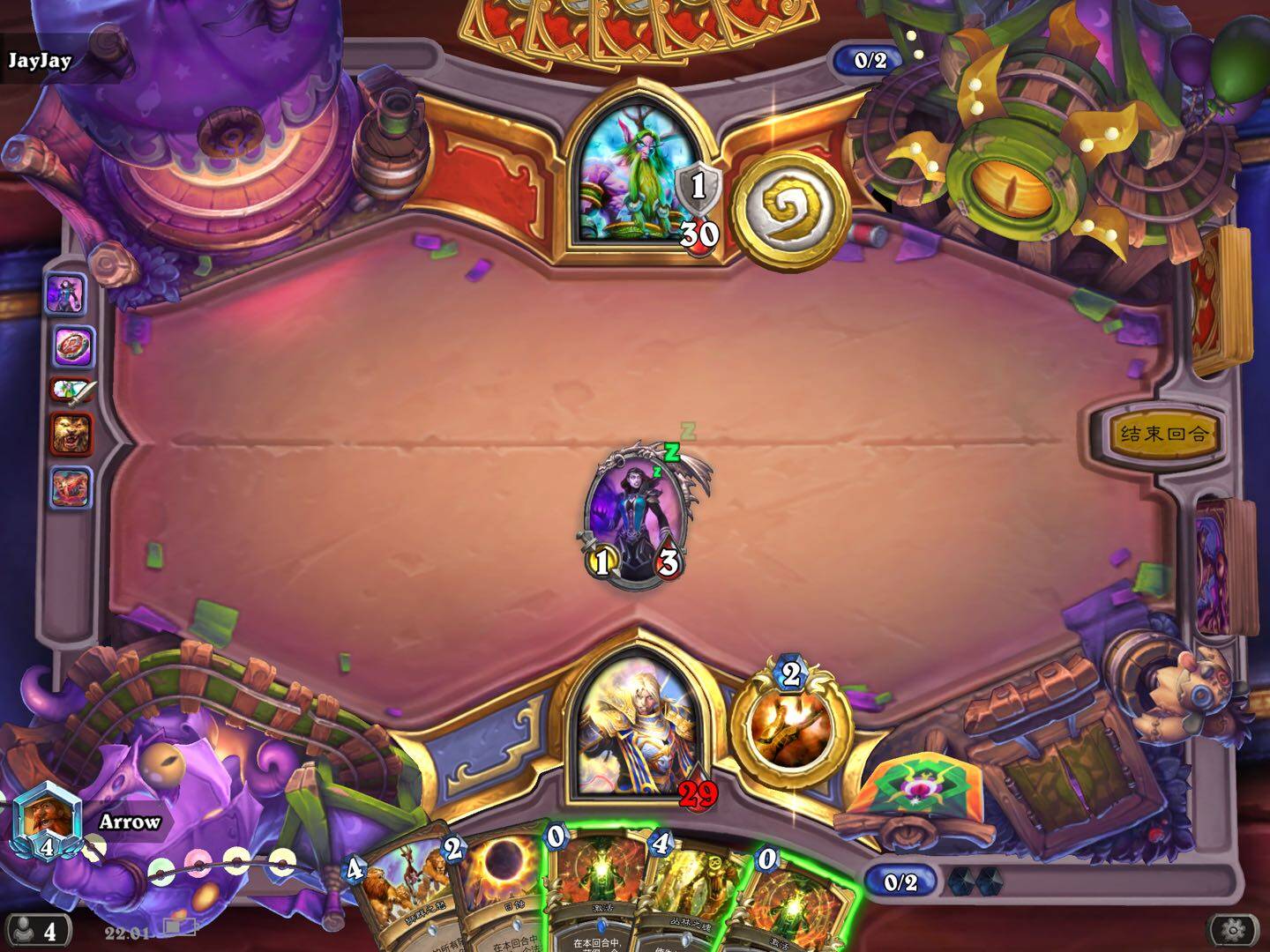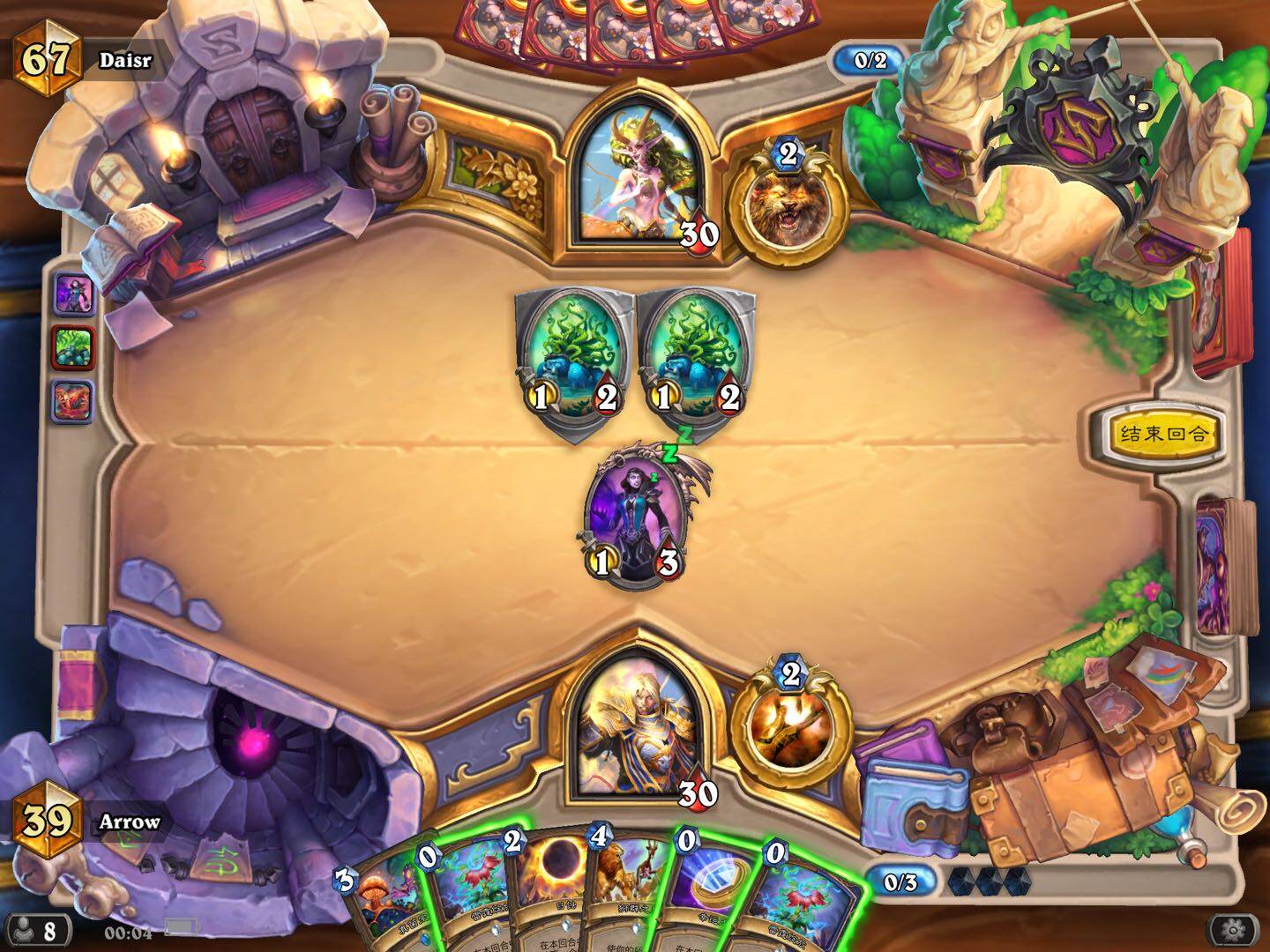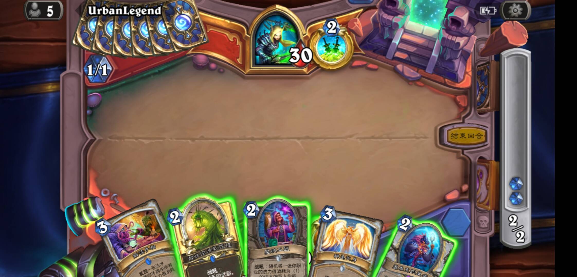 大家可以从左侧看出,对面的萨满在上回合中未使用任何元素,此时,是我们拍下光沐元素的最好时机(大家也可以从我的手牌和费用中看出,即使我手中有双光沐元素,在六费的时候我也没有拍,就是为了防对面的池塘)。