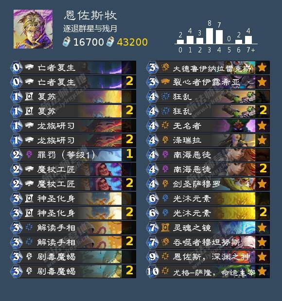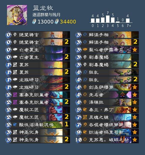 亡语瞎:起手龙族研习和神圣化身必留,因为亡语瞎是一个源源不断的赖场卡组,前期我们不要主动去做场面交换,而是多多筹备制造一个大哥,因为亡语瞎的解大怪的能力极其孱弱,还有一个制胜点就是对手开头后有怪未拍或两费三费亡语猪死后未拉怪出来时,只要血线压力没那么大,一定要拍吃手手,此时极大概率吃到恩佐斯/判官/佛丁。关于带/使用金牌猎手克里的亡语瞎,也有个小细节做好了可以反杀:对手场上挺多随从有克里,此时打镜子血赚返场,如果有克里但随从不多,血线压力不大的话,可以慢点操作,几张牌选来选去,诱惑对手铺场给压力,再打镜子返场;另外,狂乱与克里,这种情况要用狂乱选择对手威胁度最小的怪,结果会是场面上只存活你狂乱选择的随从。