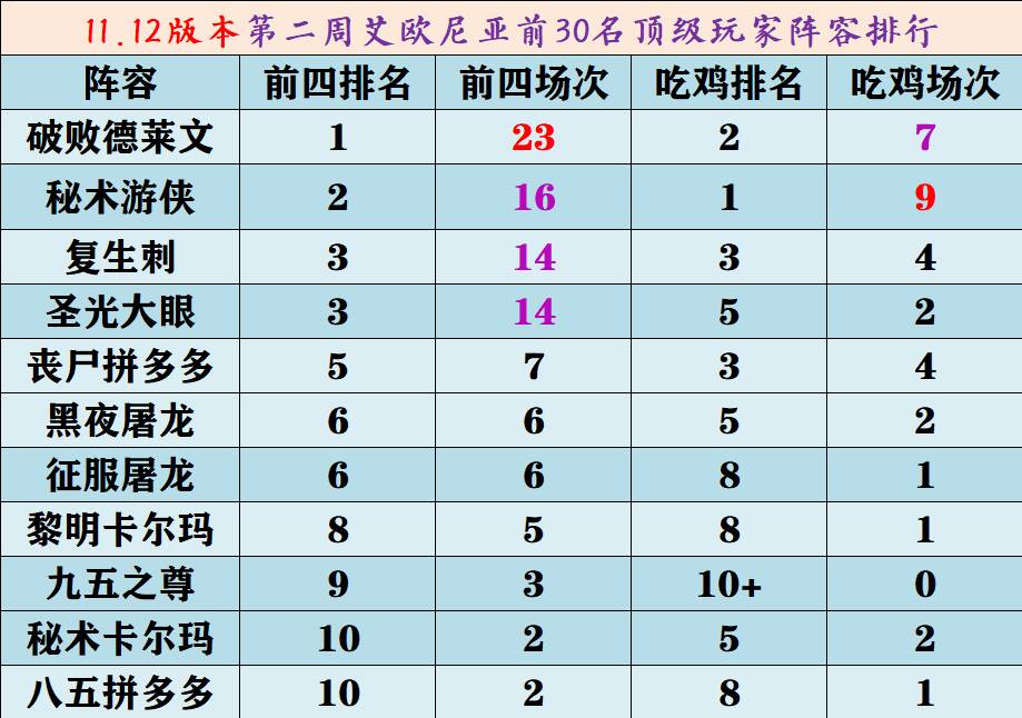 秘术游侠是这次统计中吃鸡场次最多的阵容,且吃分场次仅仅略低于破败德莱文。这版本骑士天使阵容大幅度减少,秘术游侠可以说是这版本吃分最稳的阵容,对法系阵容均大幅度克制,且只要游侠BUFF启动,集火秒敌方棋子非常快,吃分吃鸡强度非常高。