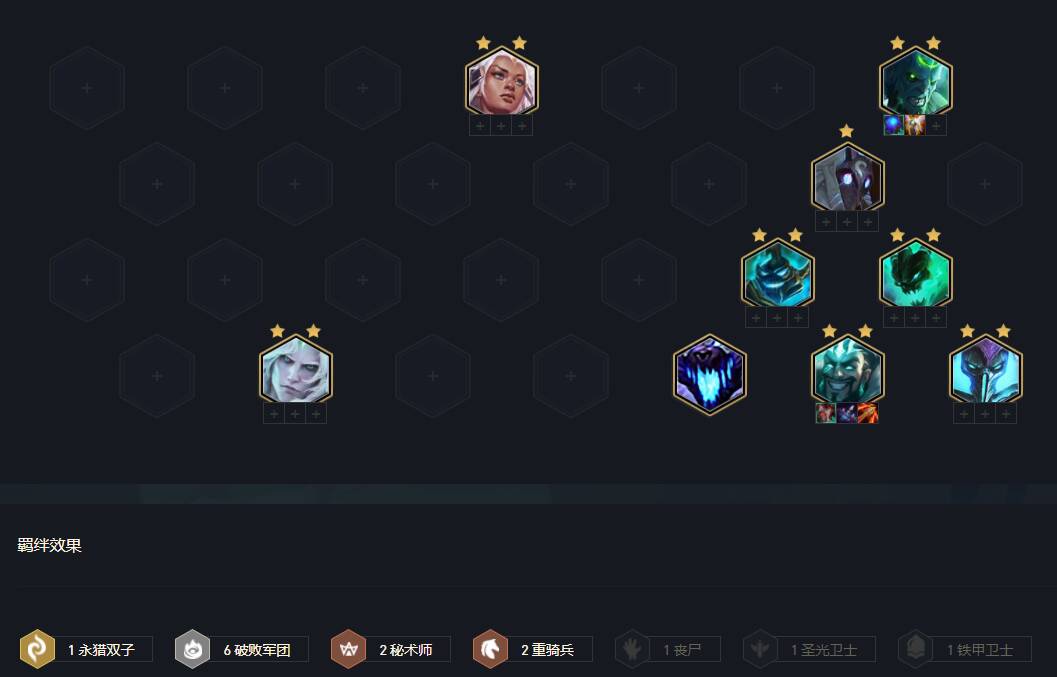 棋子构成:从上到下,从左到右依次为:芮尔、瑞兹、艾翁、千珏、赫卡里姆(人马)、锤石、佛耶戈、德莱文、维克托。