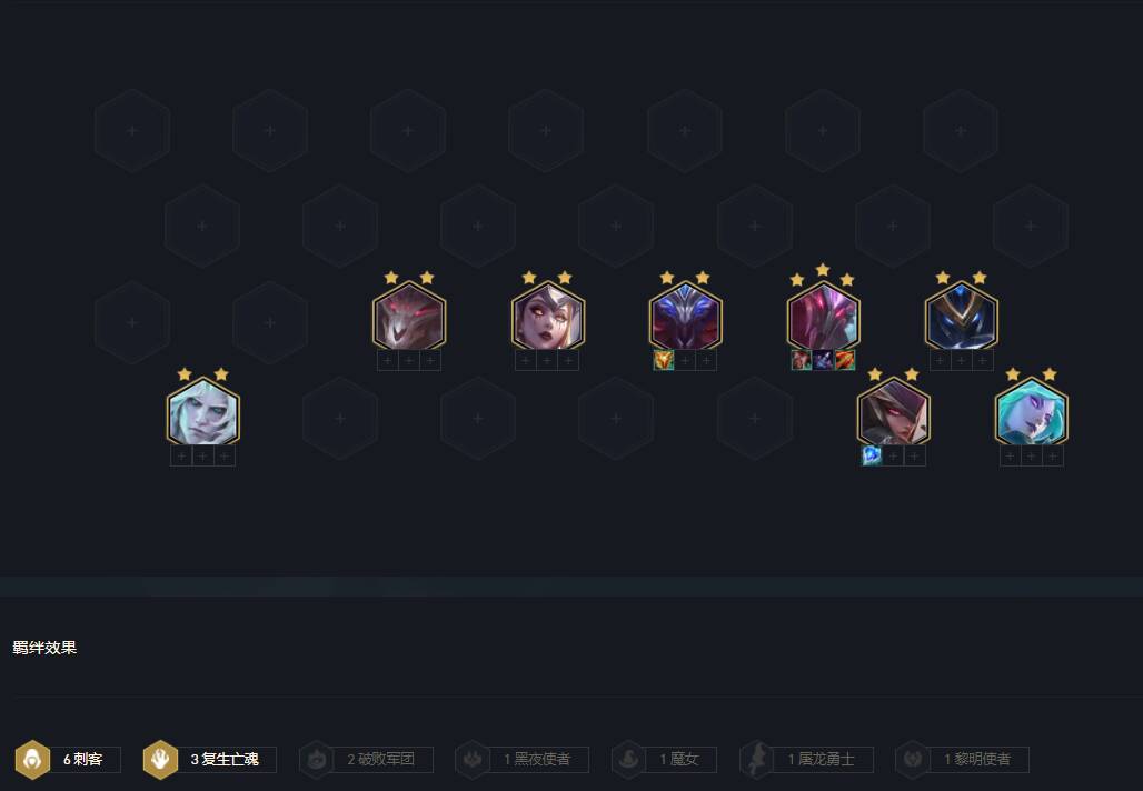 这版本初期的时候法系较为猖狂,版本除法系阵容外均是对抗法系而生,而复生刺是其中强度非常高的阵容之一,这次统计吃分场次与吃鸡场次均为第三名。阵容的核心就是利用魔腾的高攻速快速清理敌方后排,进而获得最后的游戏胜利,这套阵容吃分很稳定,但吃鸡比较看魔腾是否3星与佛耶戈的装备。
