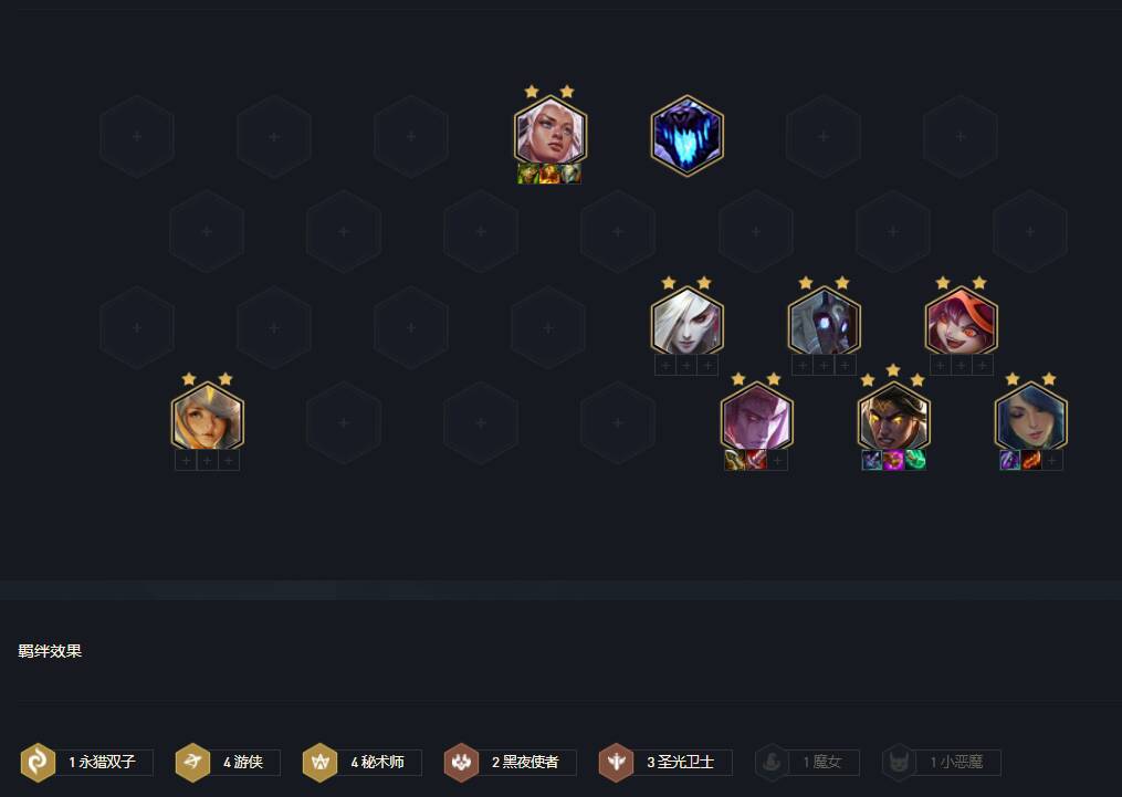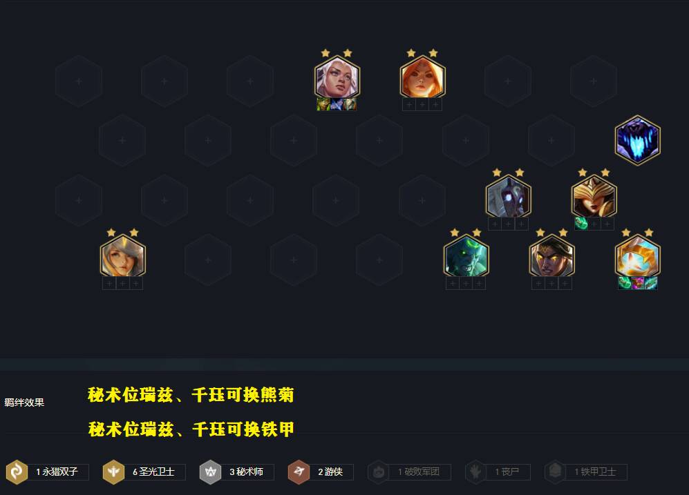 关键羁绊:4游侠+3圣光+4秘术。阵容主C韦鲁斯,副C月男,主坦芮尔。