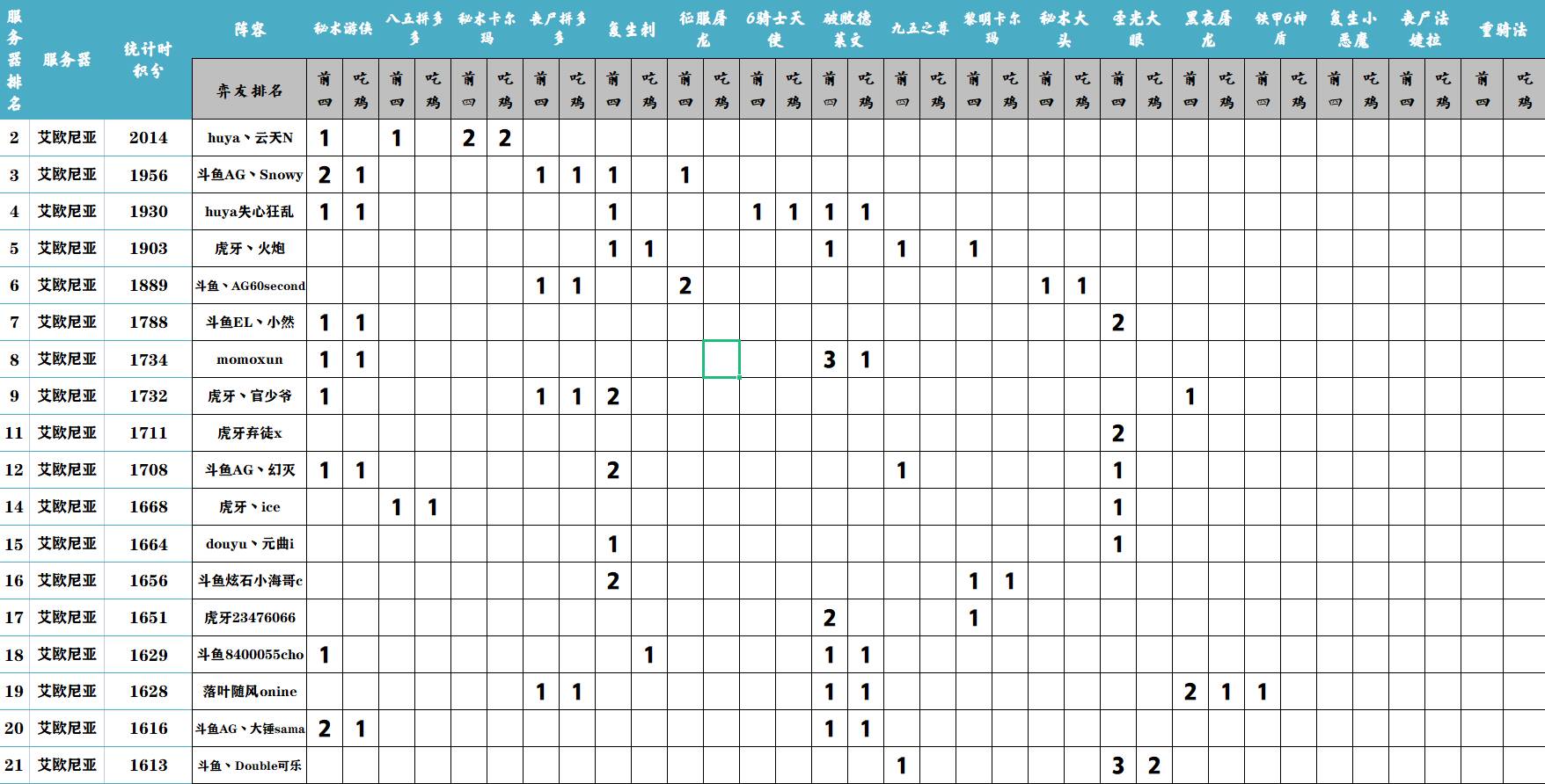 本次摩昂统计了11.12版本6月14日—6月20日统计时的艾欧尼亚服务器排名前30名玩家的最近5场排位赛(场次不够5场排位赛名次顺延),只统计进入前4名的对局。