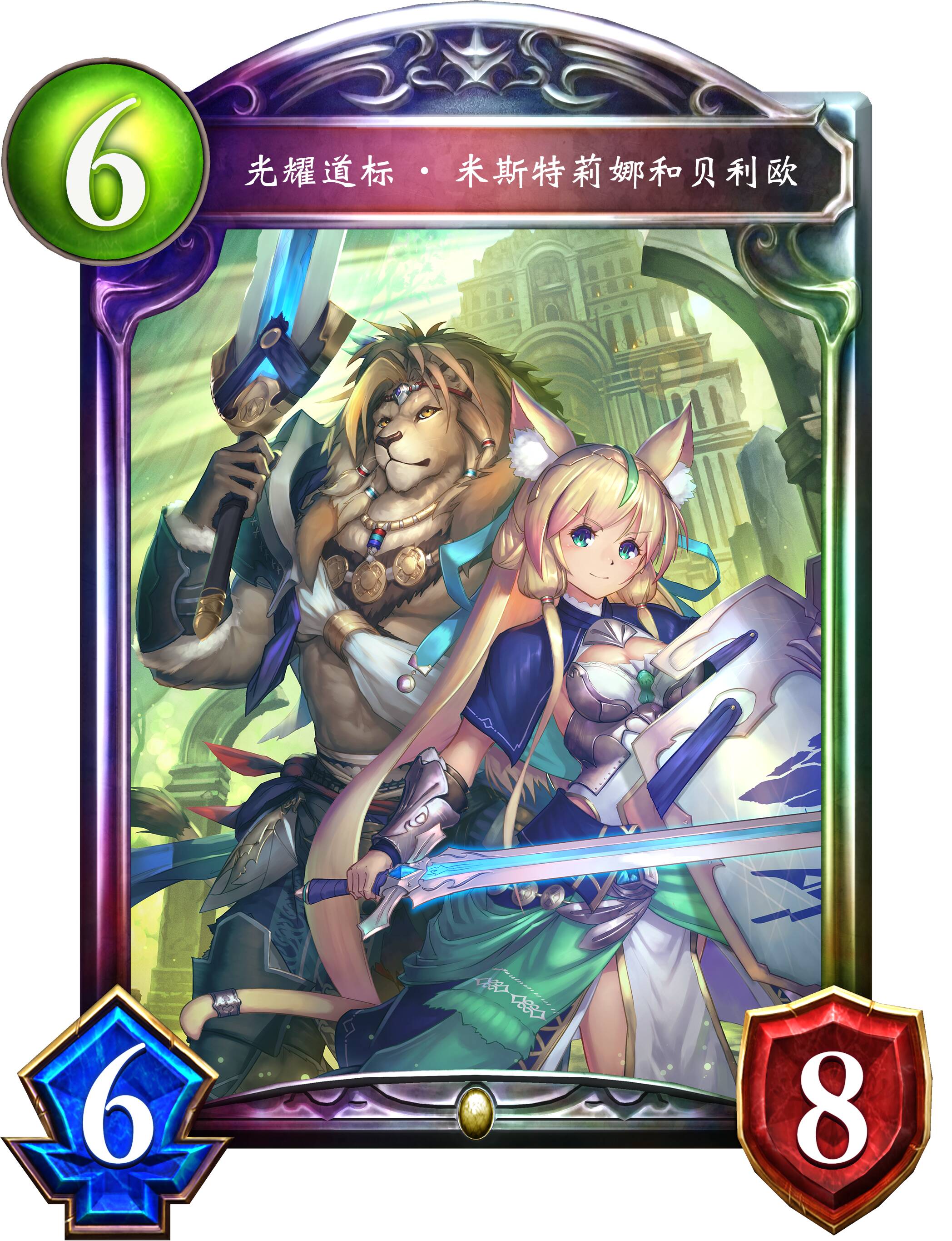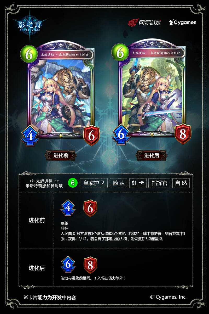 今天我们会为大家带来第二十一弹卡包物语重归的两张全新单卡:皇家护卫职业的虹卡光耀道标·米斯特莉娜和贝利欧,以及同样来自皇家护卫职业的金卡向阳处的邂逅。