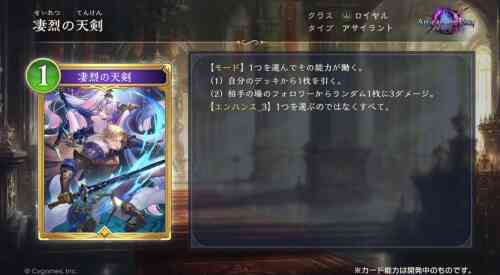 ファンファーレ ランダムな相手のフォロワー1体に5ダメージ。手札にアミュレットがあるなら、それを1枚捨てて、+2/+1する。ナテラの大樹を捨てたなら、さらに、自分のPPを3回復。