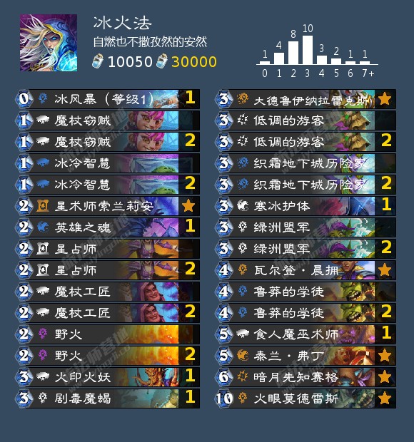 原作者说他参考了营地老哥mofish的卡组,在这个基础上进行了一定改善。这套牌融合了设计师两个钦定的体系,将冰冻体系和火冲体系融合。卡组思路为通过奥秘和冰冻进行控场偷伤害,中期依靠技能加成后的学徒清场伤害两不误,给对面血量压力,最后依靠火眼一锤定音 。这套牌比较亮眼的体系是将冰冻属性的奥秘体系和织霜地下城历险者相结合,可以在前面制造还可以的场面。其他卡位作者基本上都给了一些过渡卡,比如蝎子,魔杖工匠这些可以补充额外资源的优质生物,我抄了这套牌打了个三连胜(连排三个超生德,野火+鲁莽的学徒乱杀)。自燃也不撒孜然的安燃希望大家可以跳出法术法的思维定式,多尝试尝试其他构筑的法师卡组。